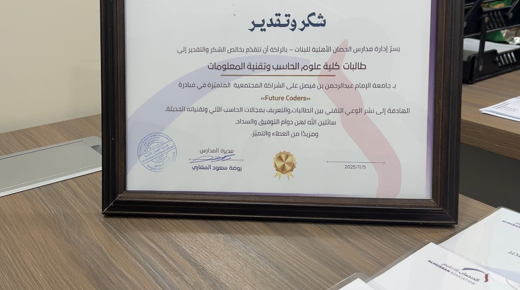 في إطار تعزيز الشراكات المجتمعية بين المؤسسات التعليمية، تمّ تعاون جامعة الإمام عبدالرحمن بن فيصل – نادي الحاسب الآلي مع مدارس الحصان الأهلية (البرنامج الدولي) بالراكة، بهدف دعم التواصل المعرفي وتبادل الخبرات بين طلاب الجامعة وطلاب المدارس.
