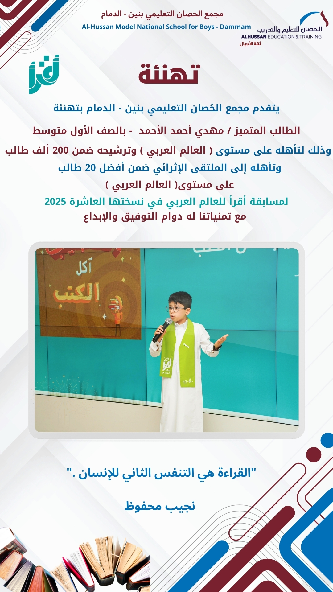 مسابقة اقرأ قامت مدارس الحصان الأهلية البرنامج الدولي بالراكة مع عدد من طالباتها بالمشاركة في لوحة وطن والمقامة في كورنيش الخبر يوم الاربعاء ١٧ سبتمبر مما يجسد روح التعاون والترابط والانتماء لوطننا الحبيب.