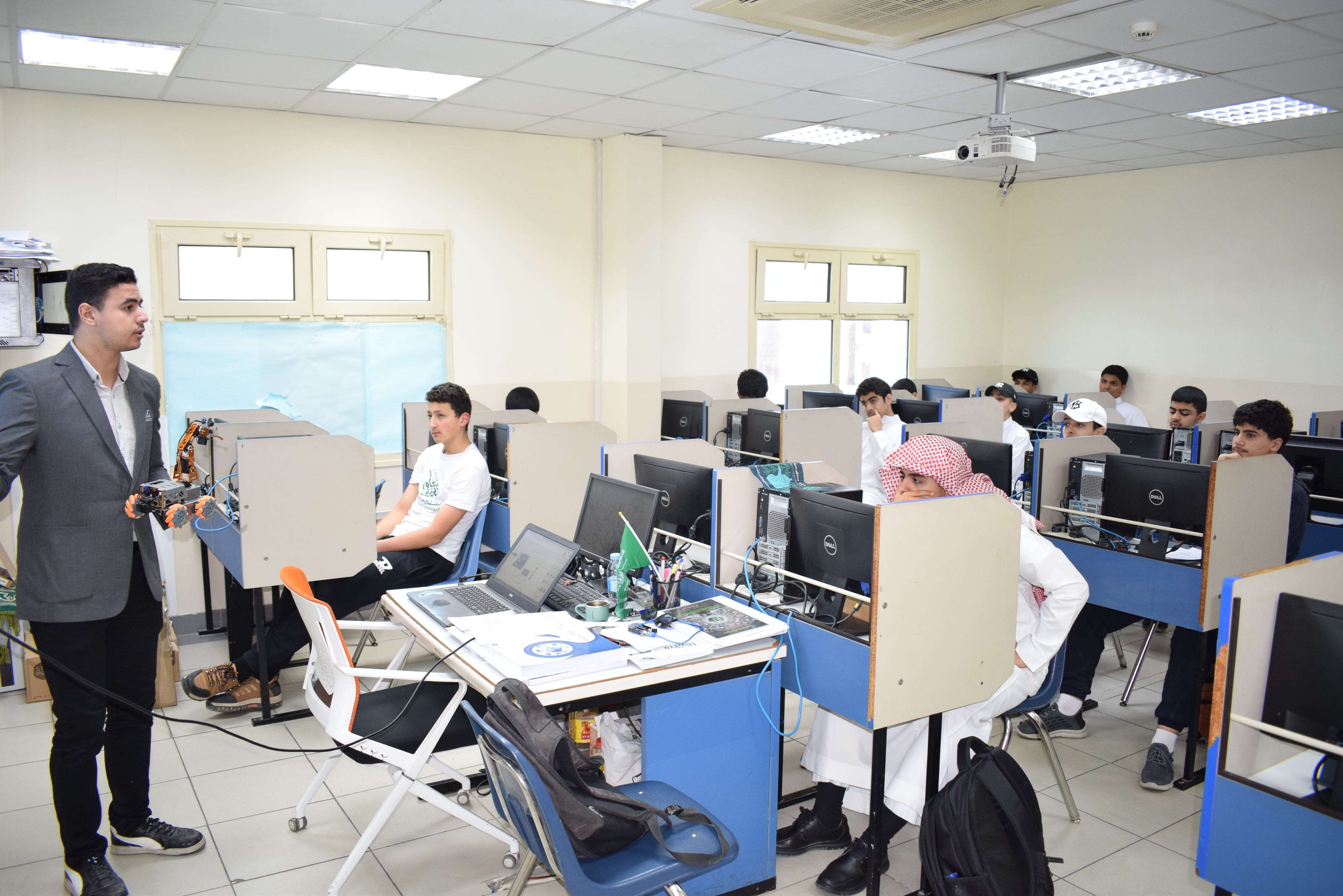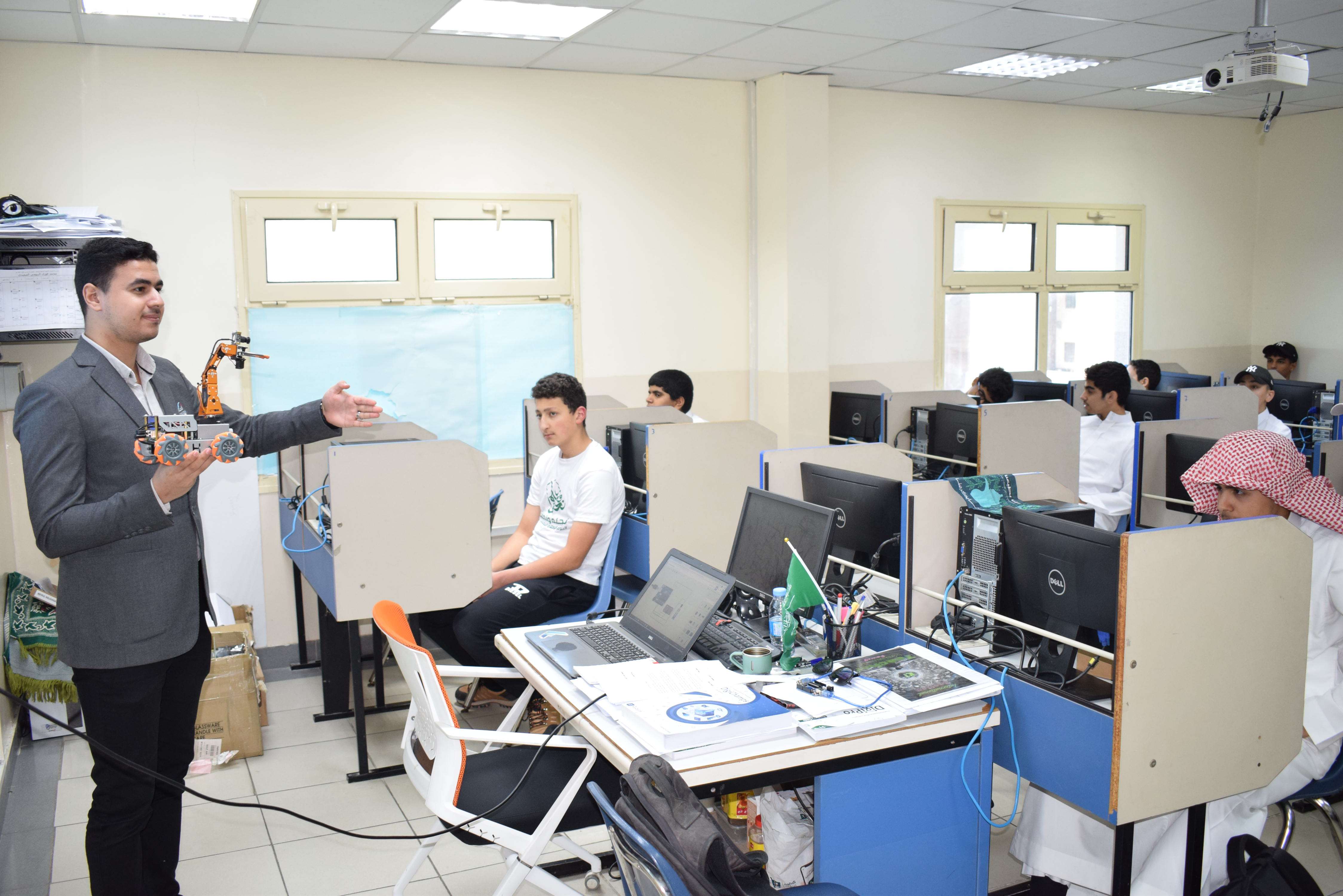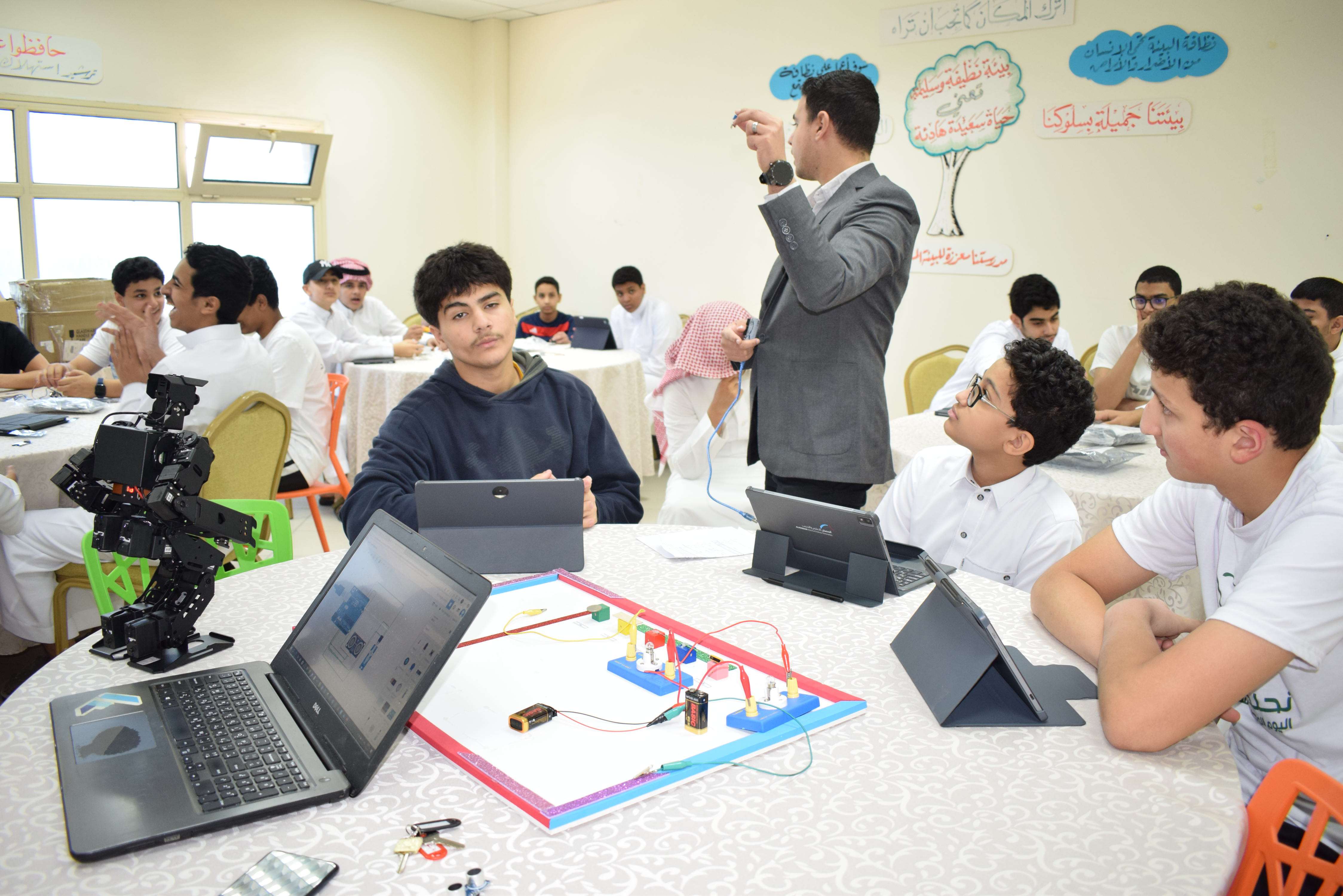 The ICT department at Al-Hussan Secondary School for Boys in Dammam held on Wednesday 1/10/2025 the first STEM sessions, where students learned how to use the Tinker cad simulation program to design and program electronic parts. The students then moved to the STEM lab to learn about the main components of sensors, motors, and other tools that they will use in STEM projects. They were also briefed on modern robots and tried them out practically, and their main parts were explained, which sparked the students’ interest and enthusiasm to start implementing project ideas