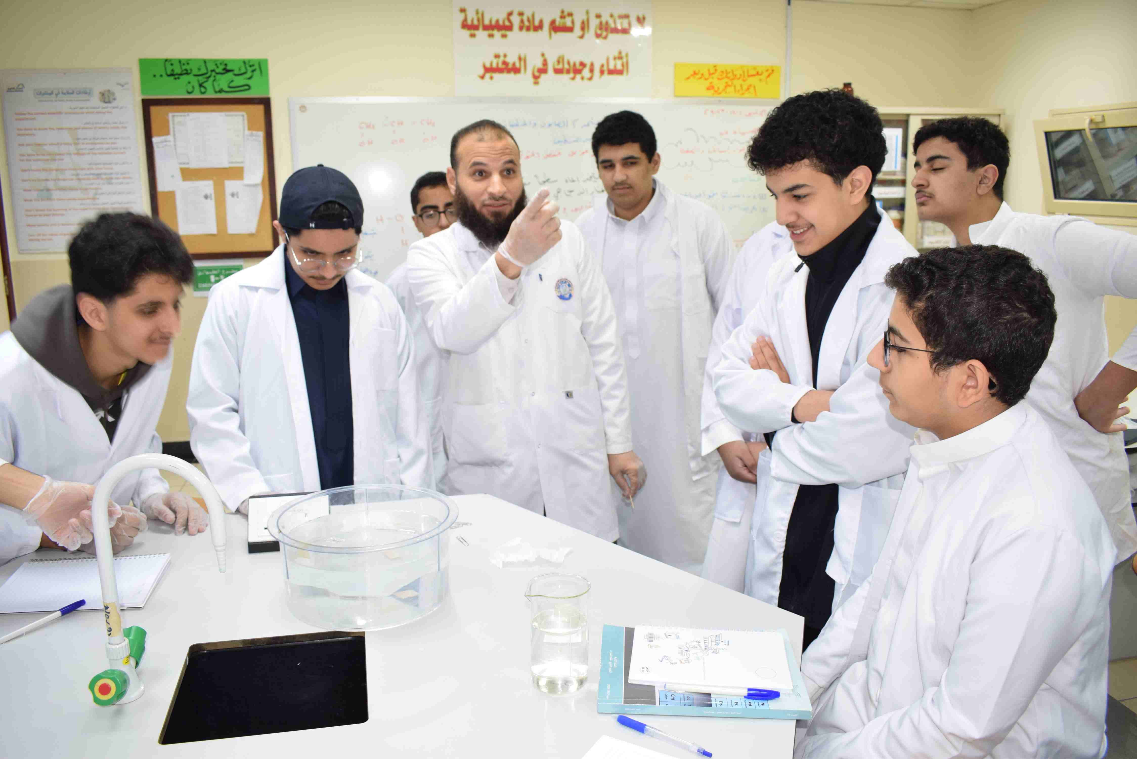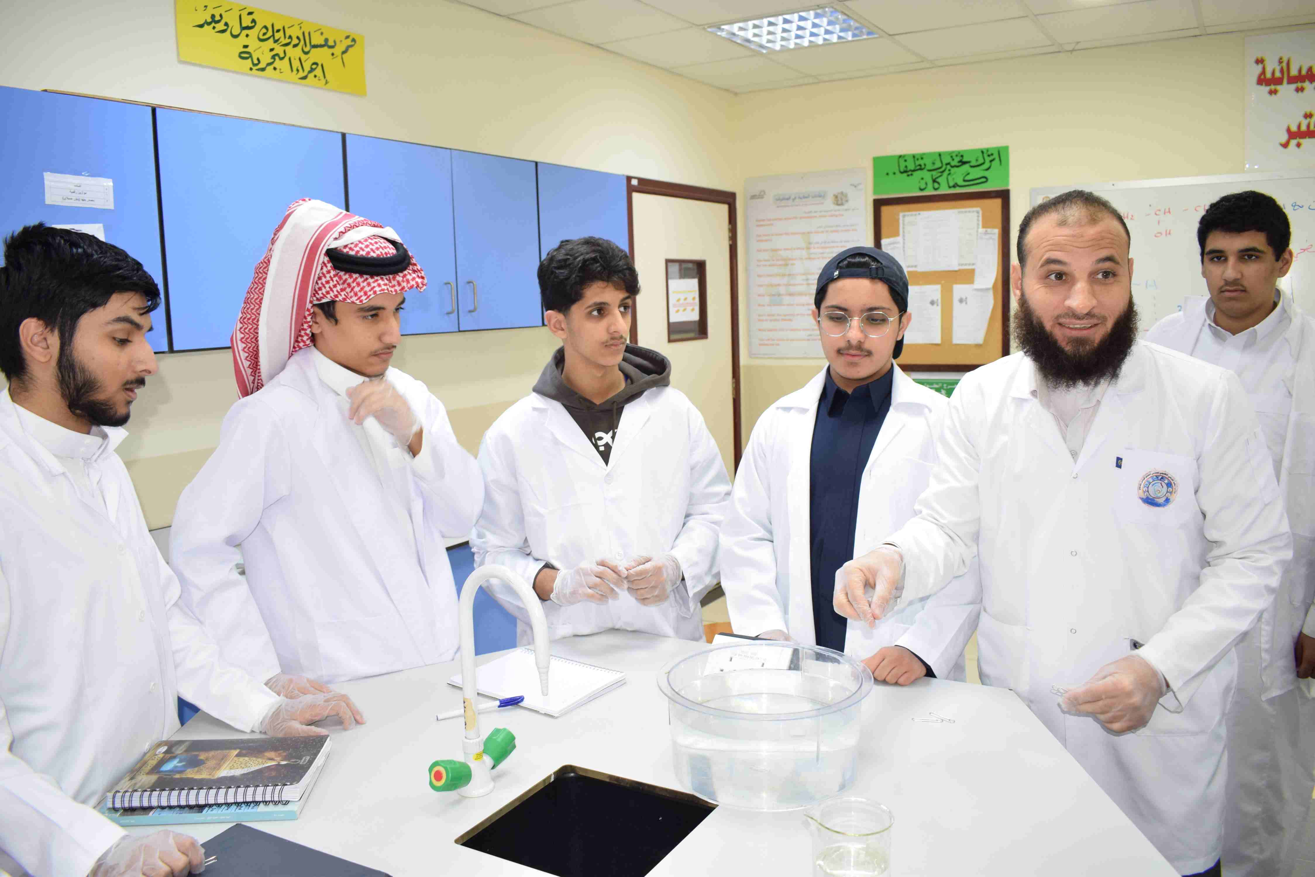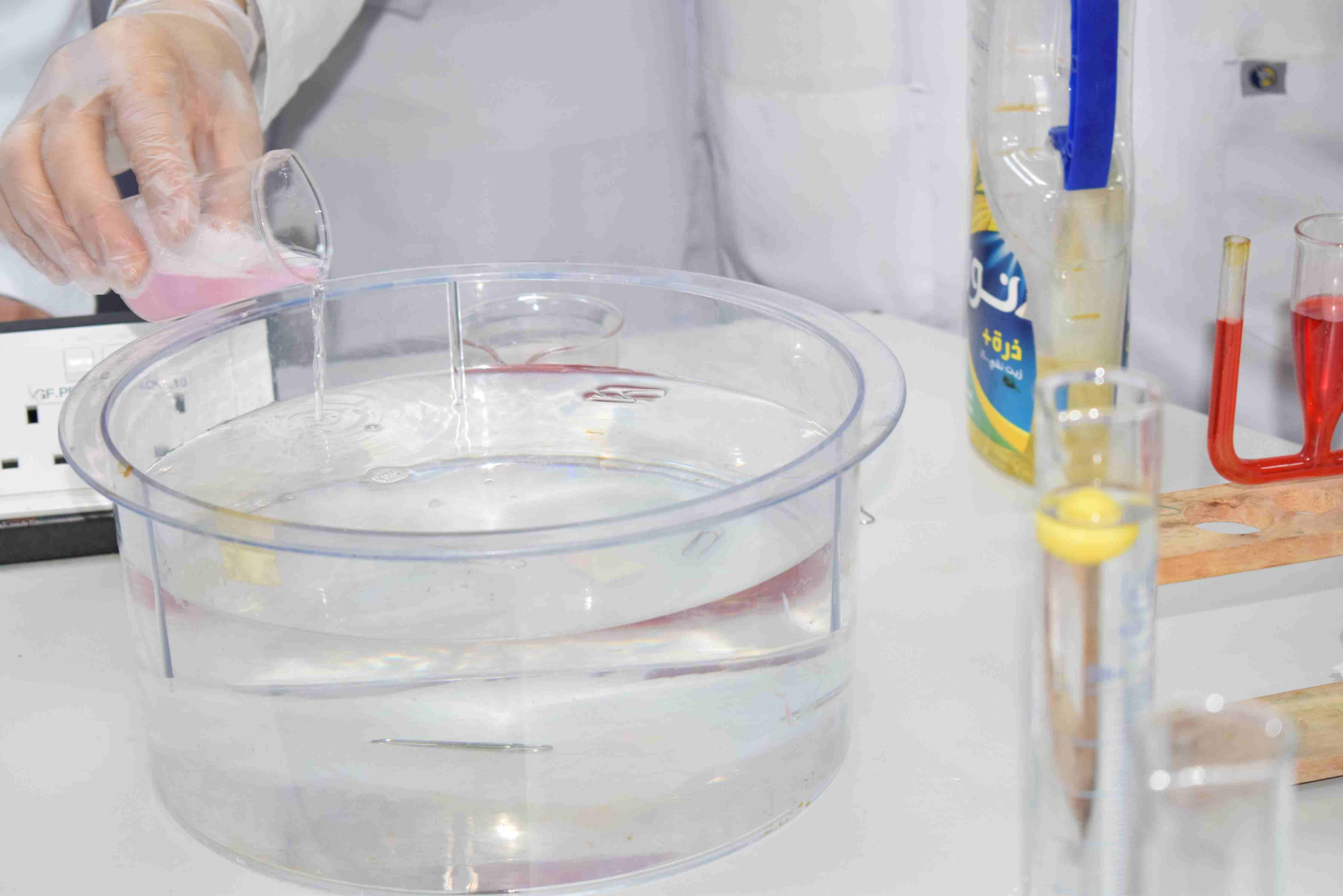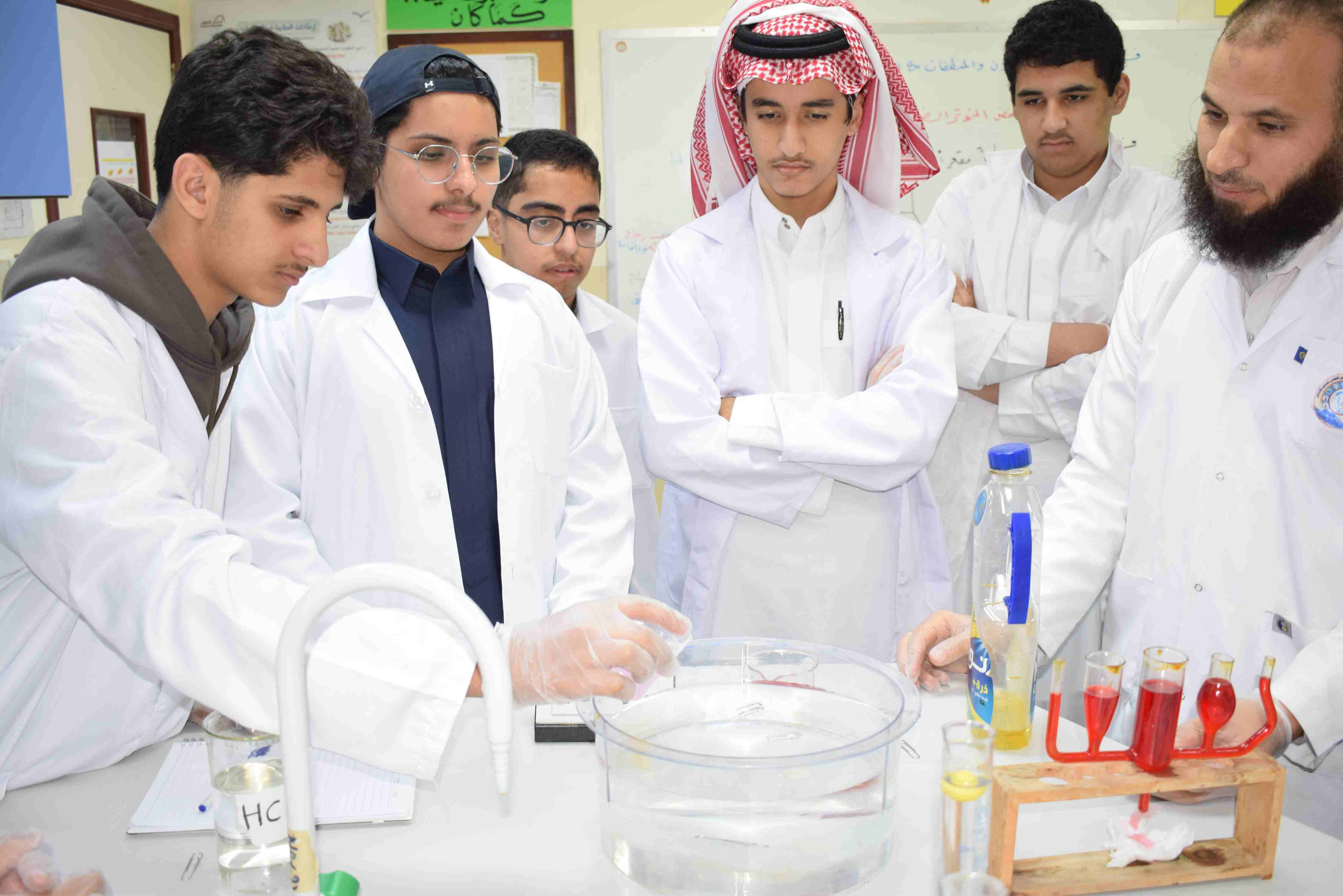 قام قسم الكيمياء بثانوية الحصان الأهلية للبنين بالدمام يوم الثلاثاء الموافق 2-12-2025م بعمل تجربة علمية لطلاب الصف الثاني الثانوي حيث قام الطلاب بعمل مجموعة من التجارب عن خصائص المواد السائلة منها اللزوجة والتوتر السطحي وتم مشاهدة طفو دبابيس الورق فوق سطح الماء رغم أن كثافة الدبوس أكبر ومشاهدة أثر المنظف على التوتر السطحي للماء.