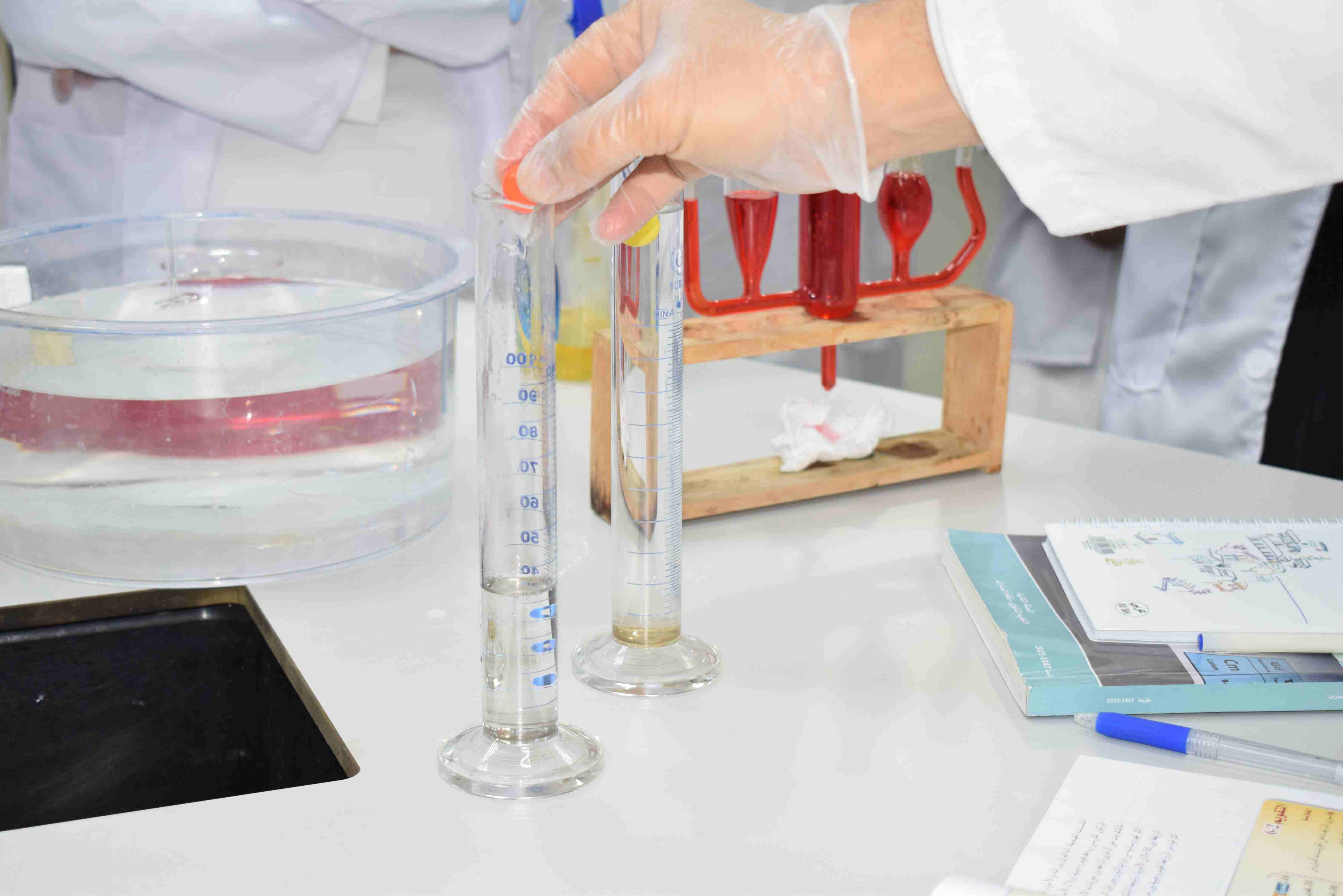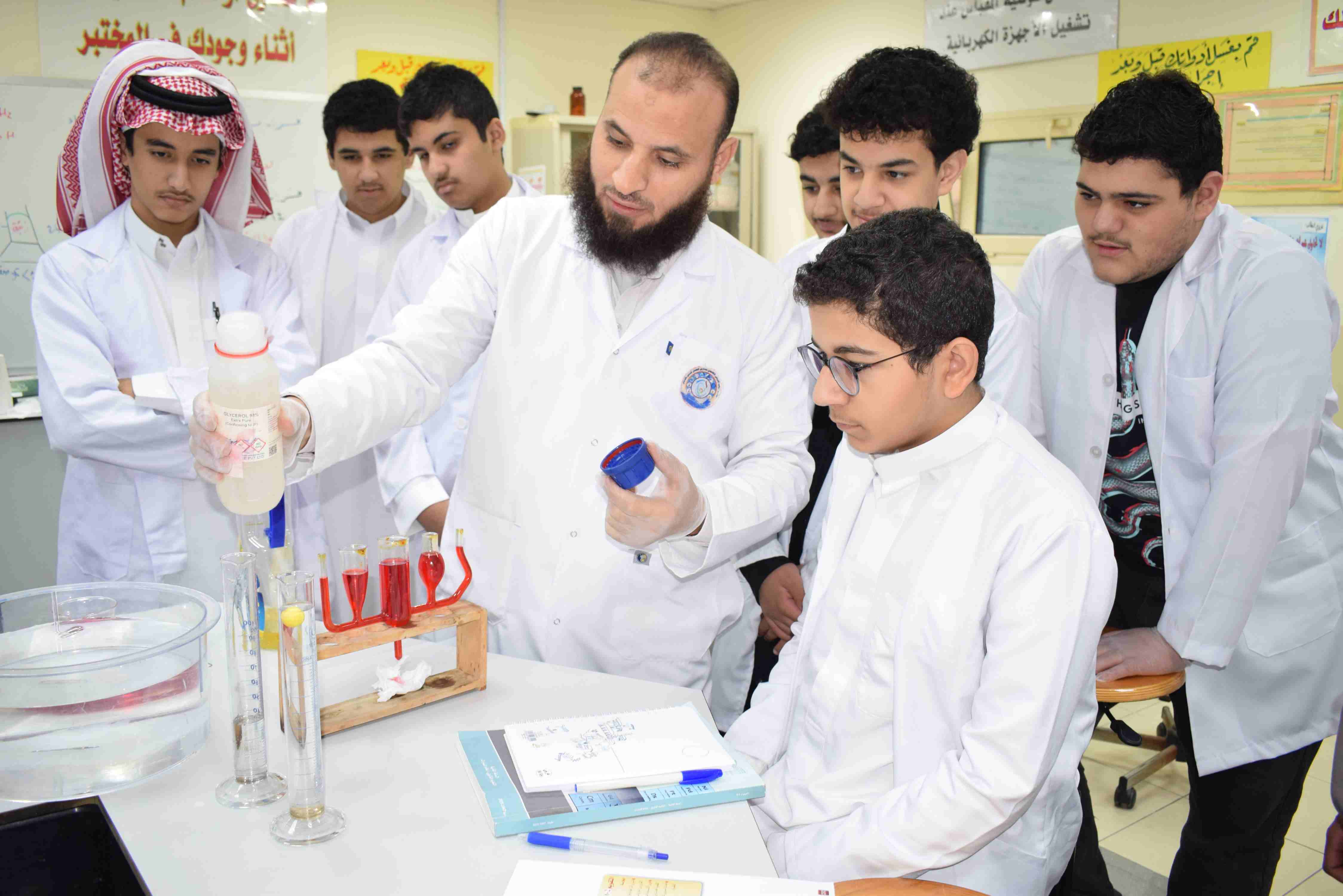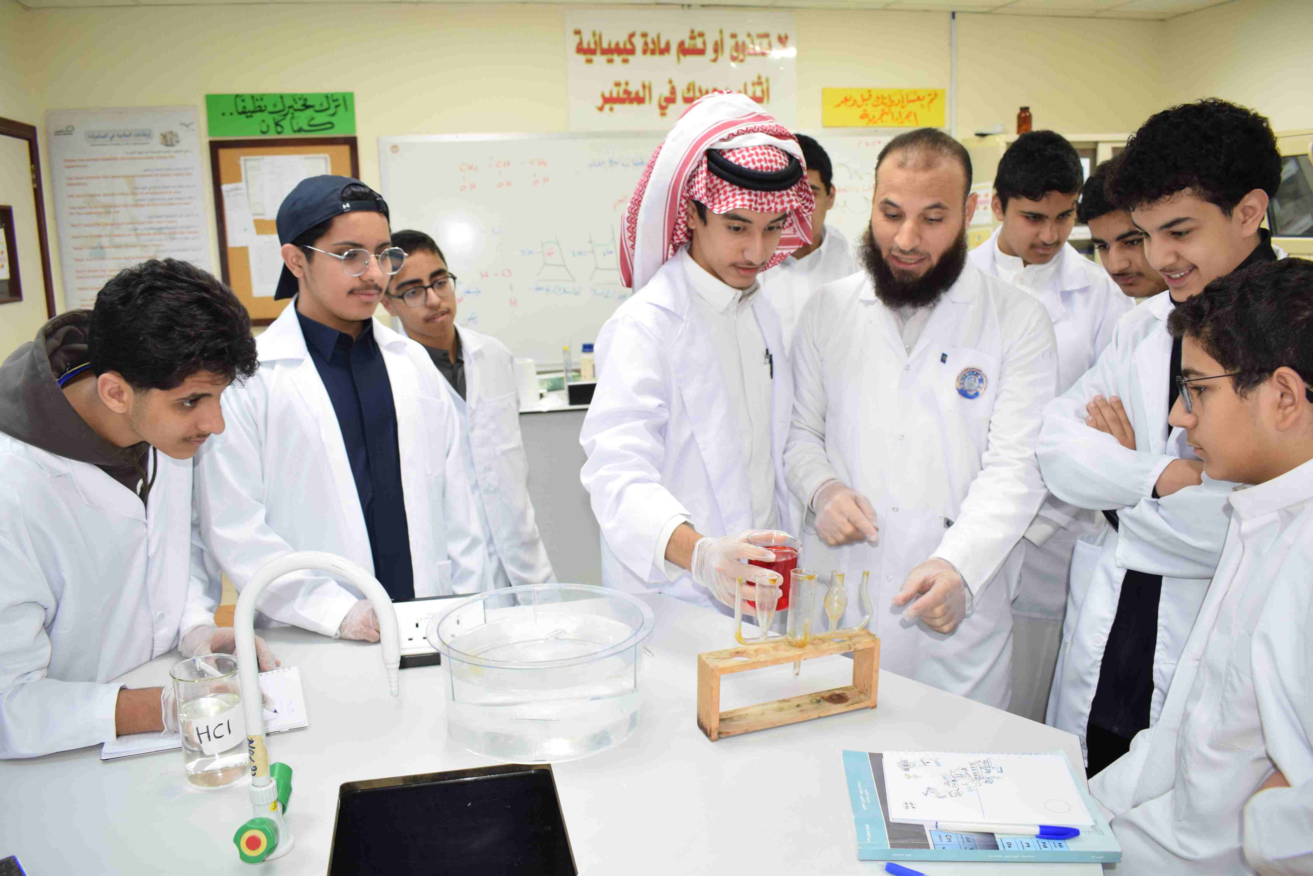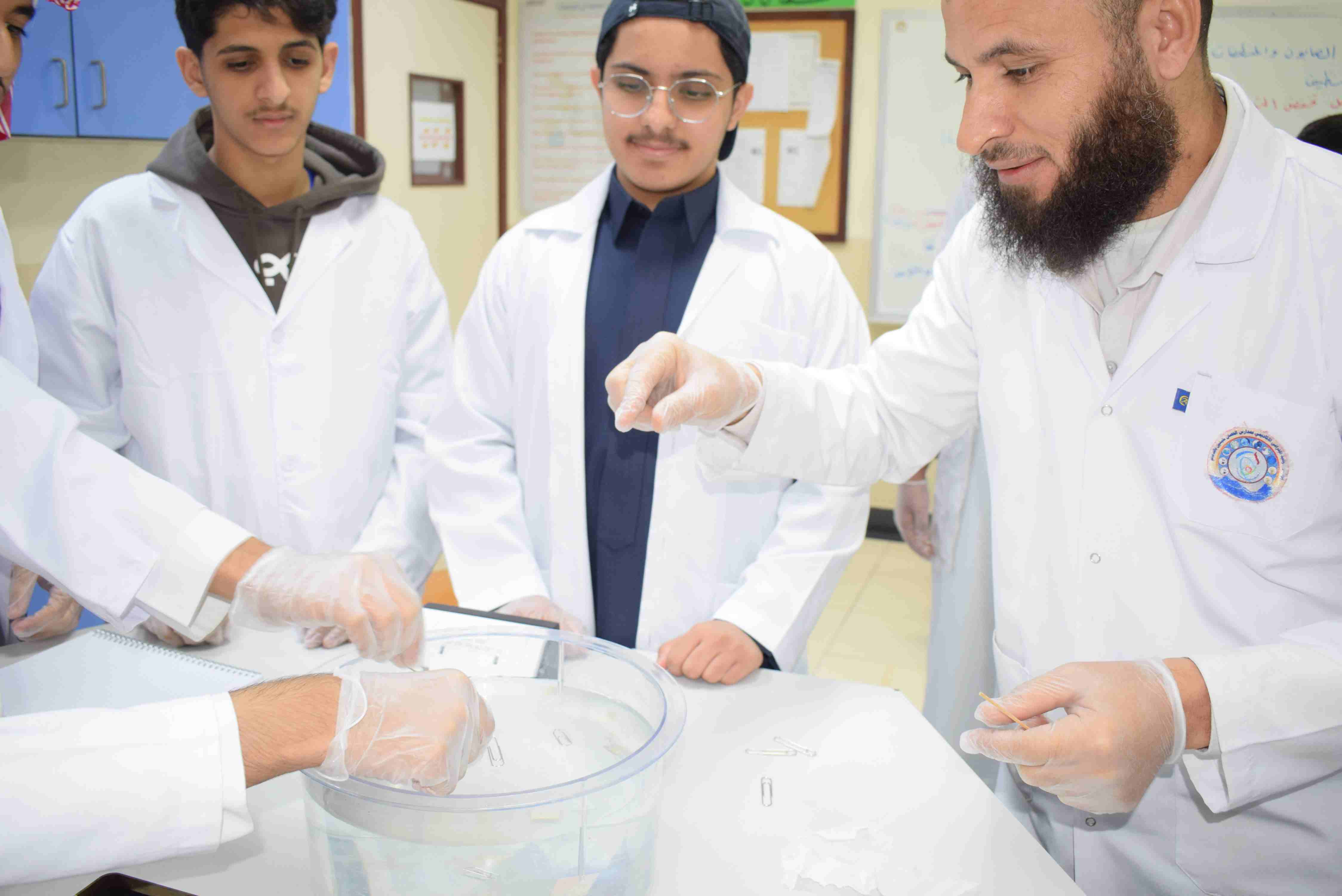 قام قسم الكيمياء بثانوية الحصان الأهلية للبنين بالدمام يوم الثلاثاء الموافق 2-12-2025م بعمل تجربة علمية لطلاب الصف الثاني الثانوي حيث قام الطلاب بعمل مجموعة من التجارب عن خصائص المواد السائلة منها اللزوجة والتوتر السطحي وتم مشاهدة طفو دبابيس الورق فوق سطح الماء رغم أن كثافة الدبوس أكبر ومشاهدة أثر المنظف على التوتر السطحي للماء.