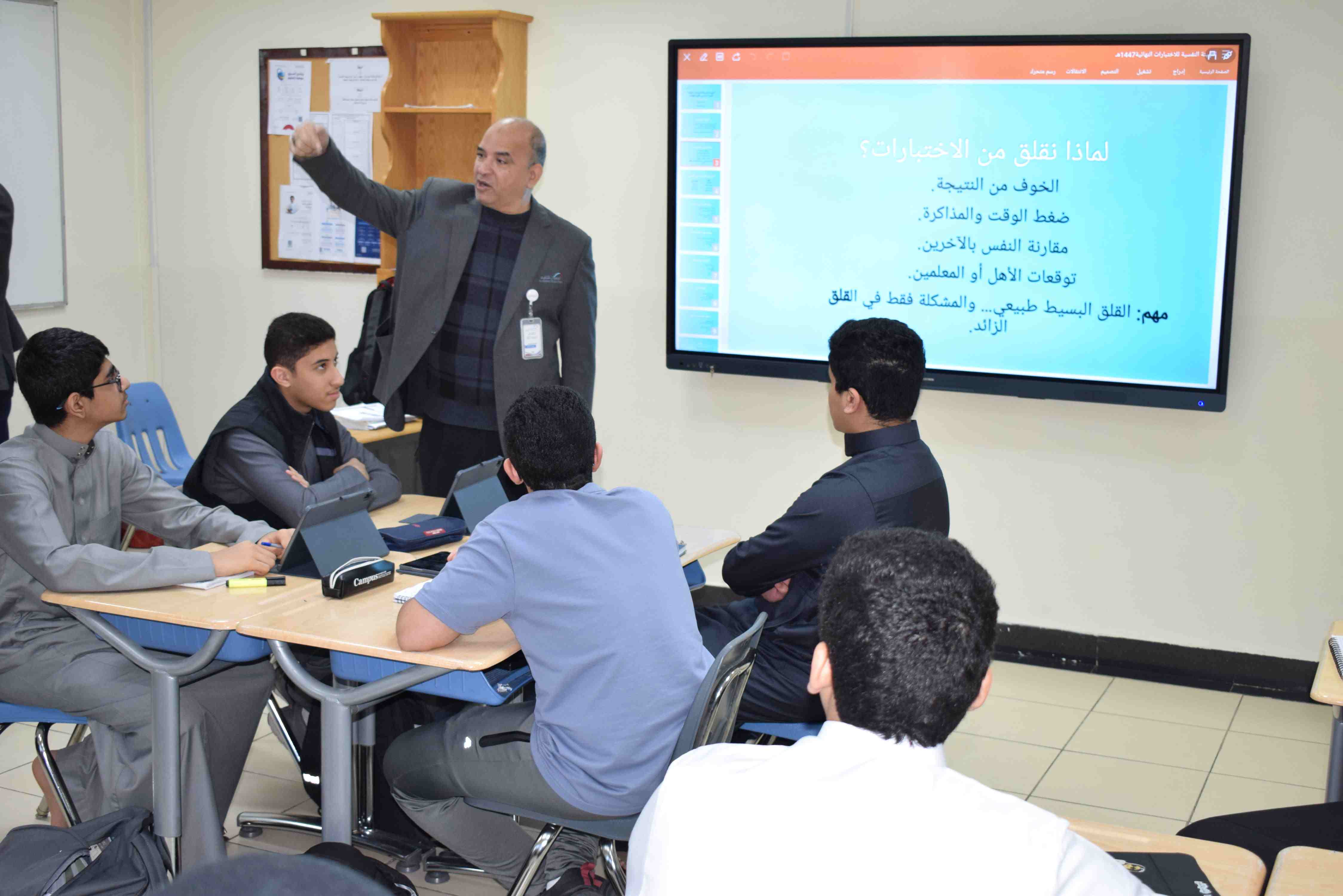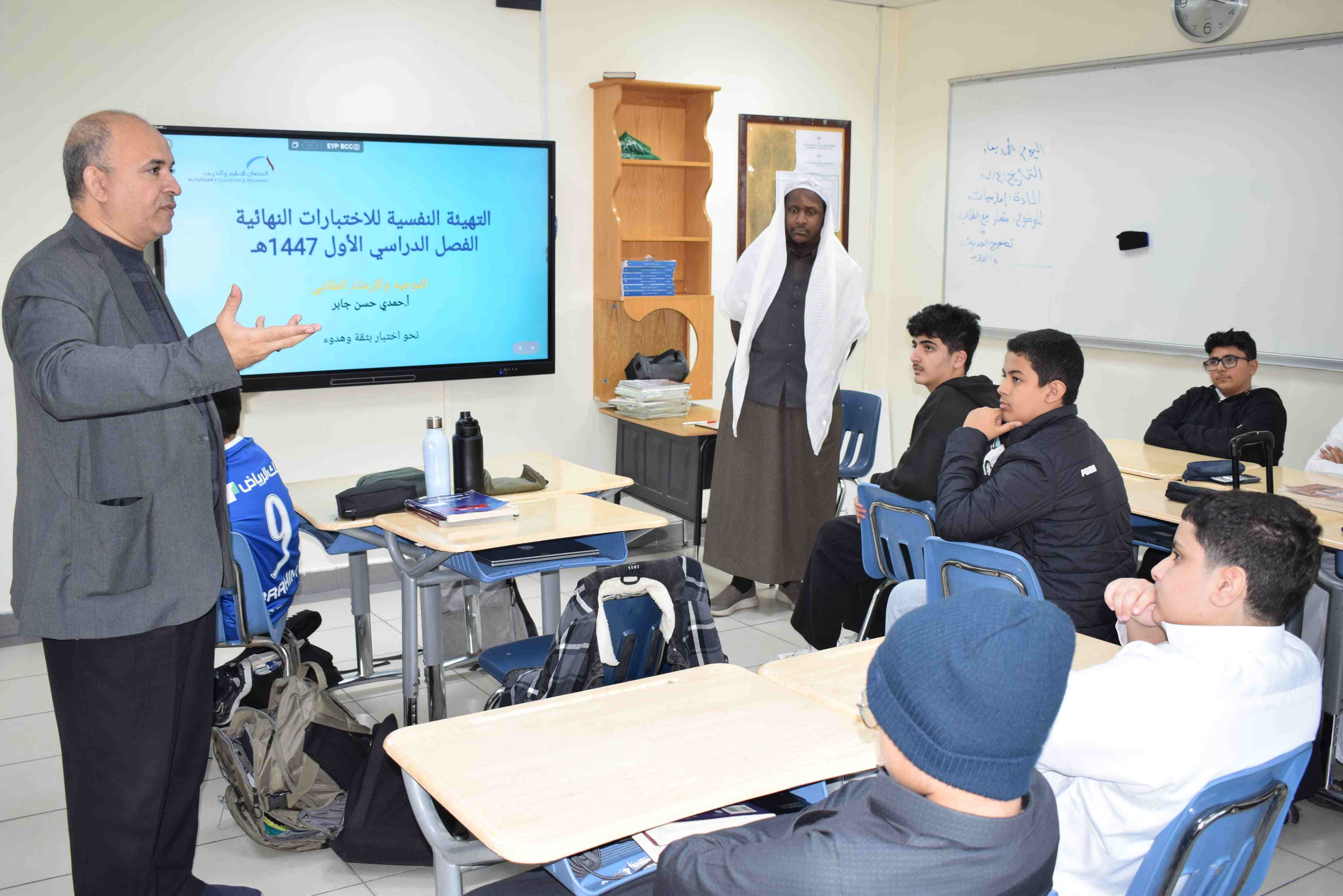 قام قسم التوجيه والإرشاد الطلابي بثانوية الحصان الأهلية للبنين بالدمام بتنفيذ برنامج التهيئة الإرشادية والنفسية للاختبارات ، للقسمين الأهلي والدولي خلال الفترة من 23-12 إلى 24-12-2025م ، حيث تم توجيه الطلاب وتهيئتهم لدخول الاختبارات وكيفية حل الأسئلة وعمل جدول يومي للمذاكرة وحثهم على النوم الباكر.