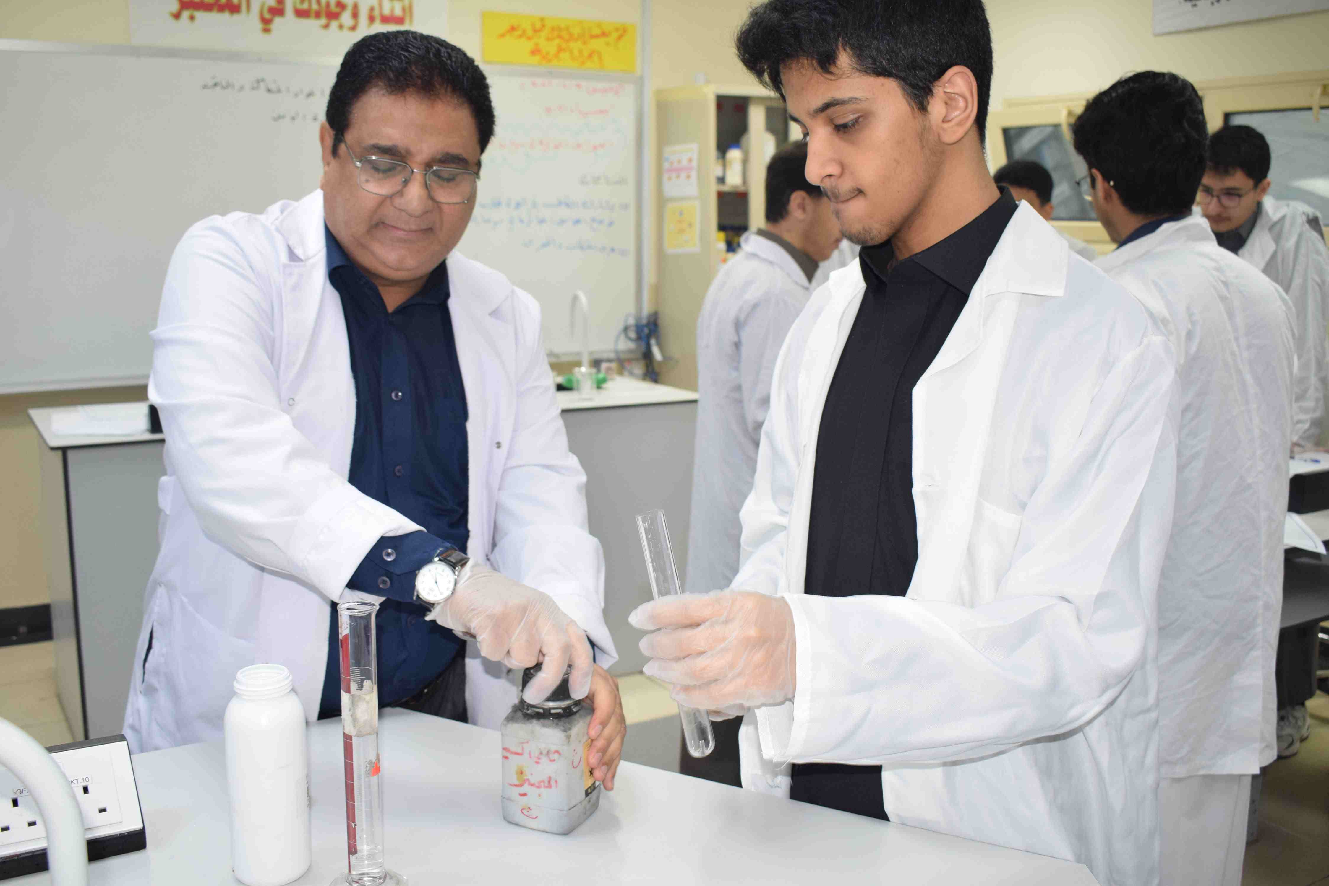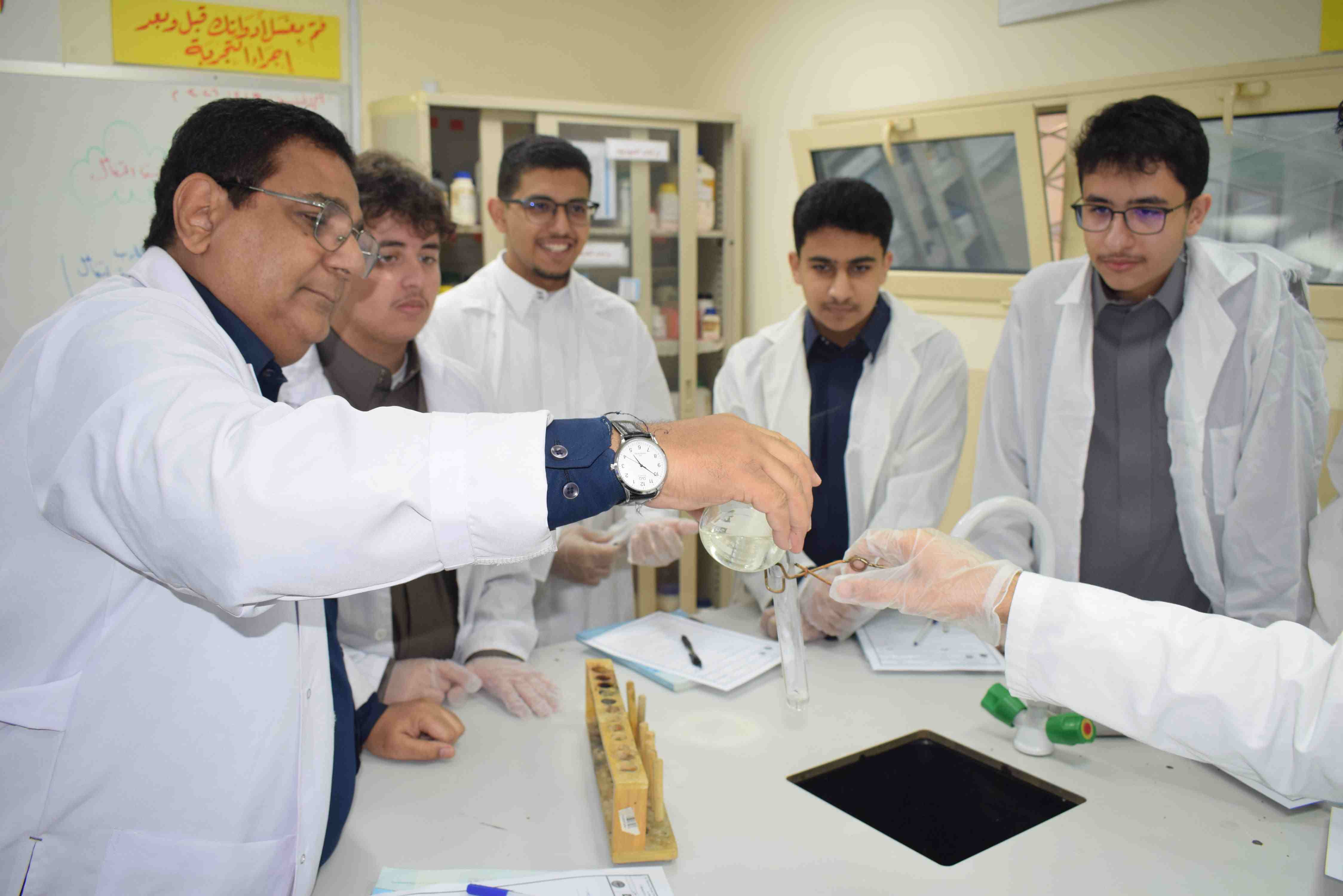 تجربة العوامل المؤثرة في سرعة التفاعل قام قسم الكيمياء بثانوية الحصان الأهلية للبنين بالدمام يوم الإثنين الموافق 9-2-2026م، بعمل تجربة علمية لطلاب الصف الثاني الثانوي ، حيث قام الطلاب بإجراء التجارب التي توضح أثر درجة الحرارة والتركيز ومساحة السطح على سرعة التفاعل.