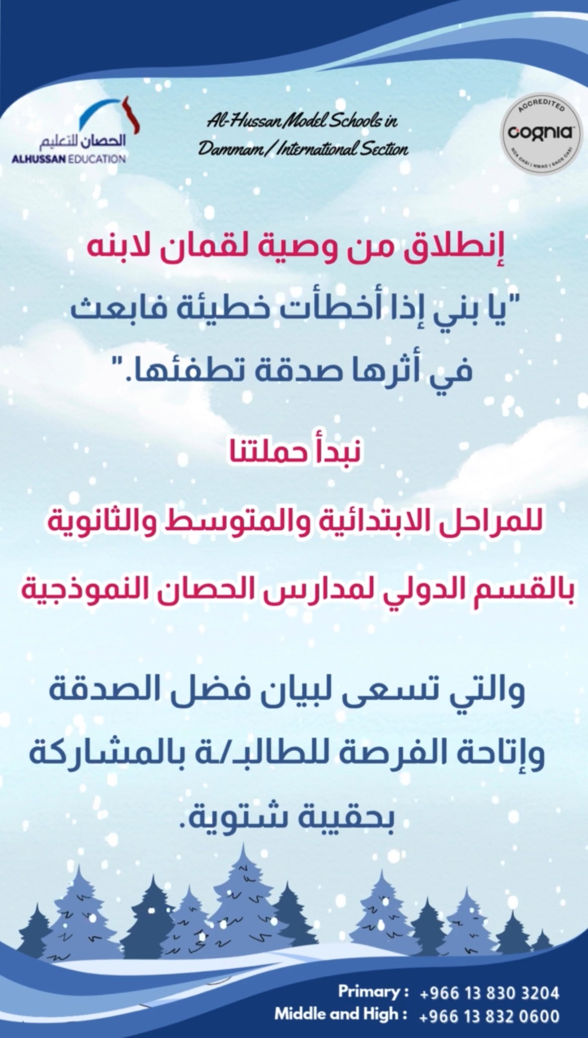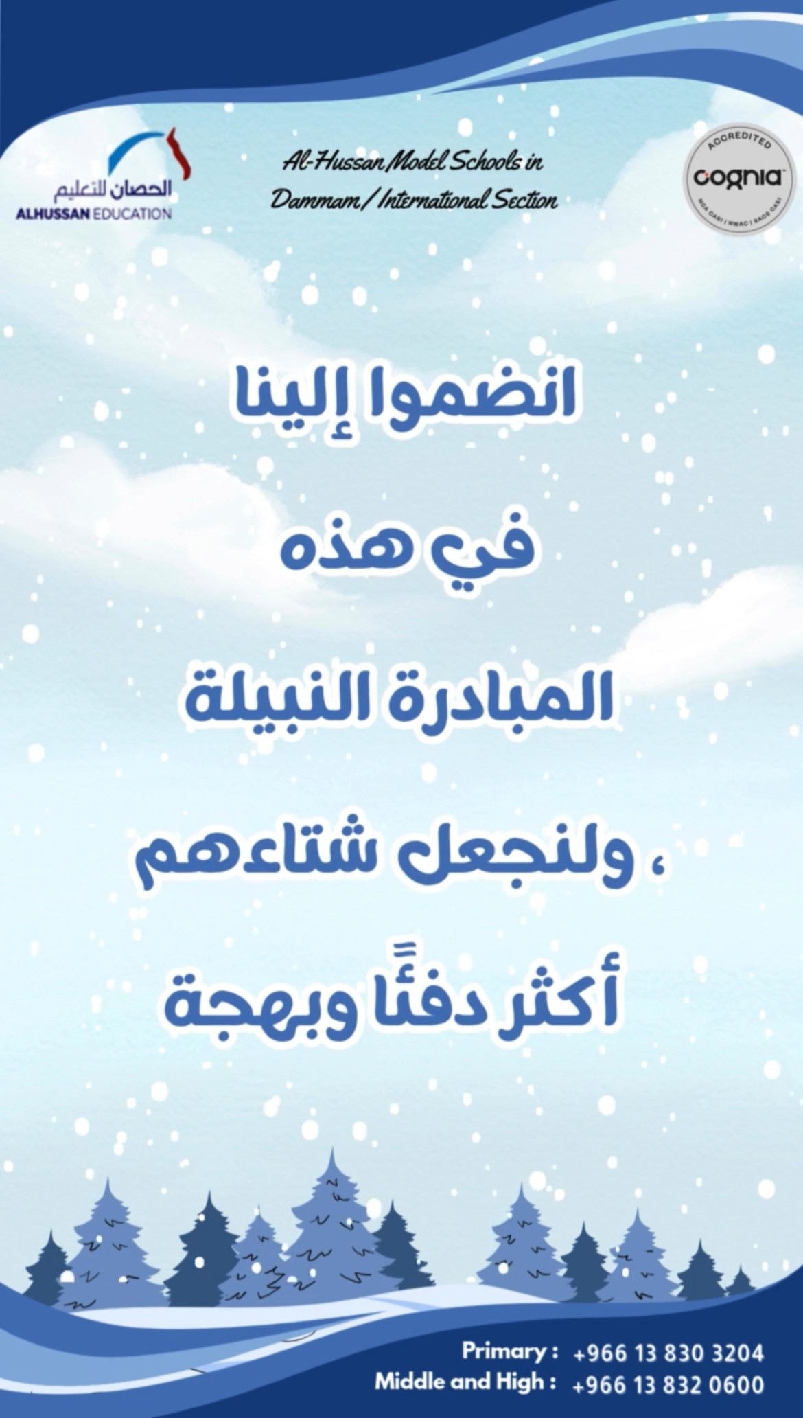 Their Winter is Warmer with You Al Hussan National Schools for Girls, the International Section in Dammam. Under the theme “Their Winter is Warmer with You,” we launch a campaign aimed at promoting the values of generosity and community participation.