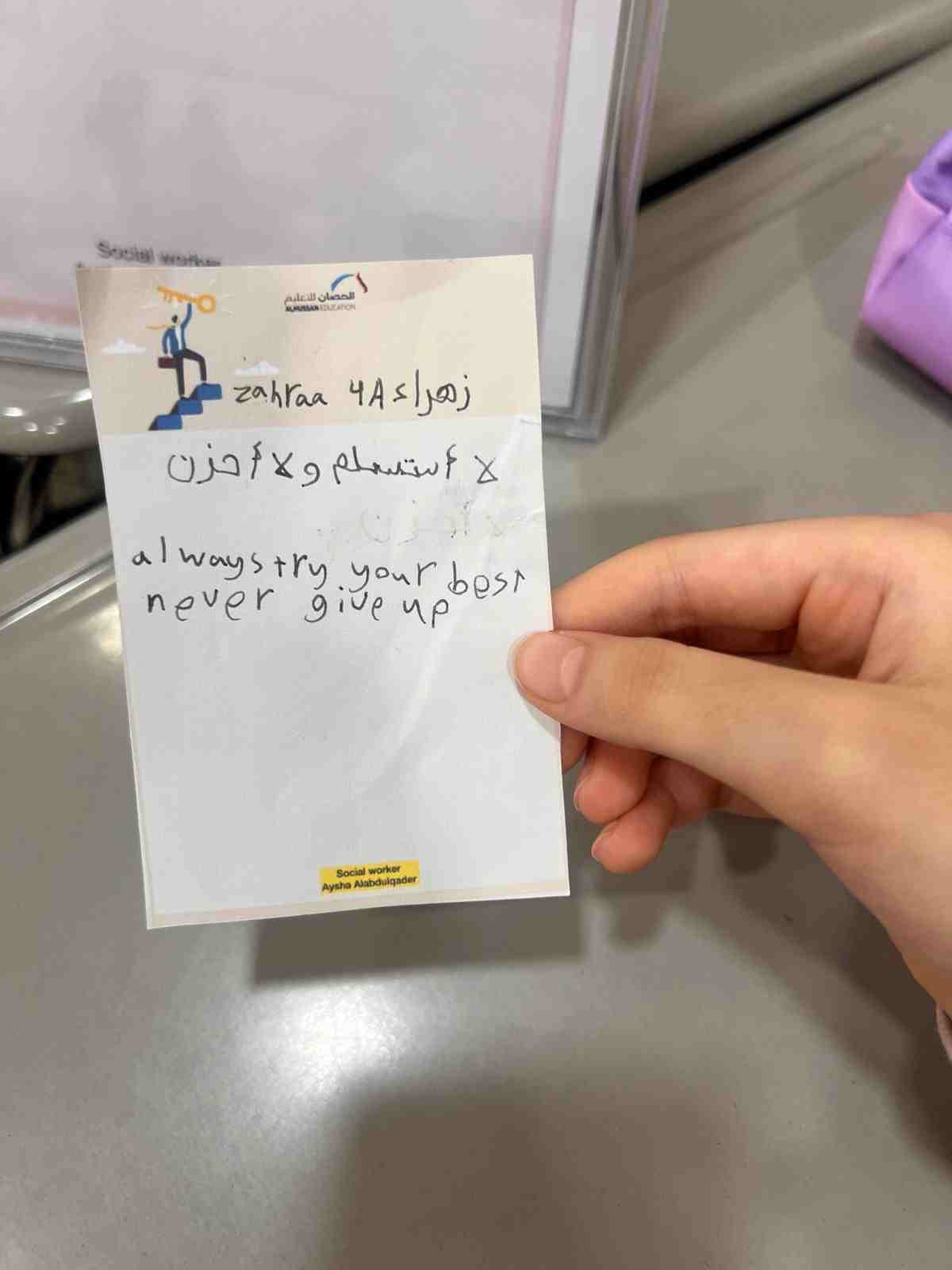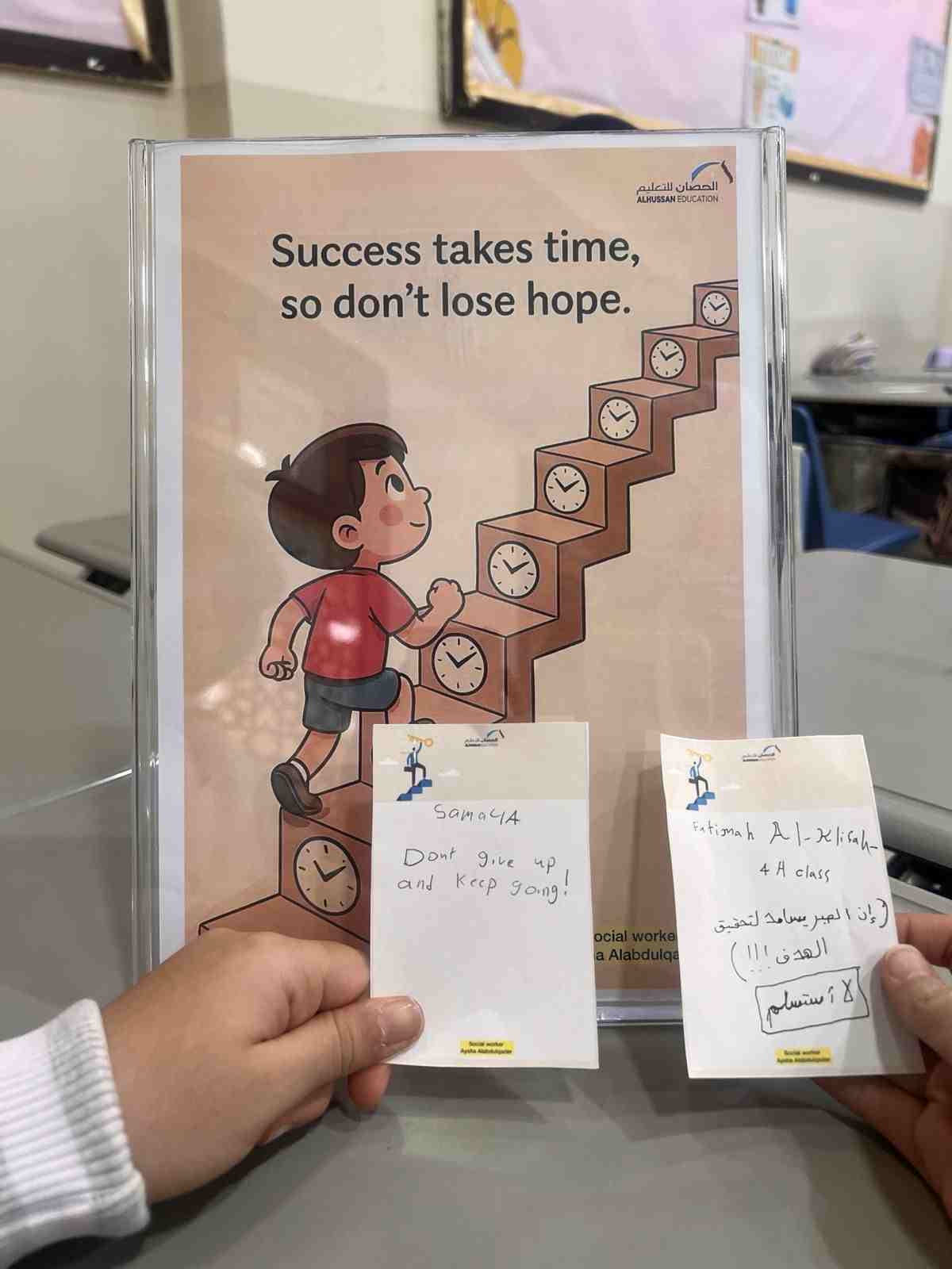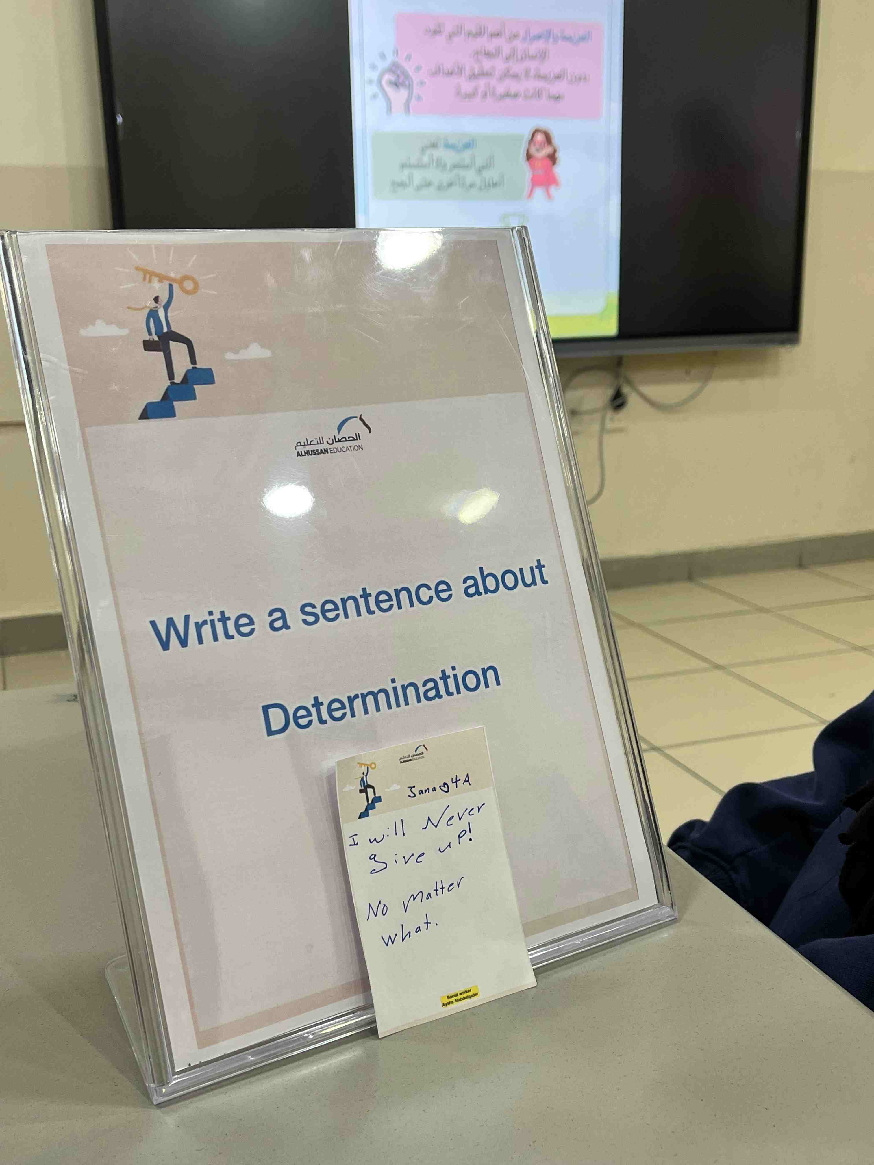 Al-Hussan National Schools for Girls – Dammam International Section Activated the Lesson on the Value of Determination in the Classroom Determination and perseverance are among the most important values that lead a person to success. Without determination, goals cannot be achieved, whether they are small or big. Determination means believing in yourself continuing to move forward, and never giving up. It means trying again and again until you succeed.