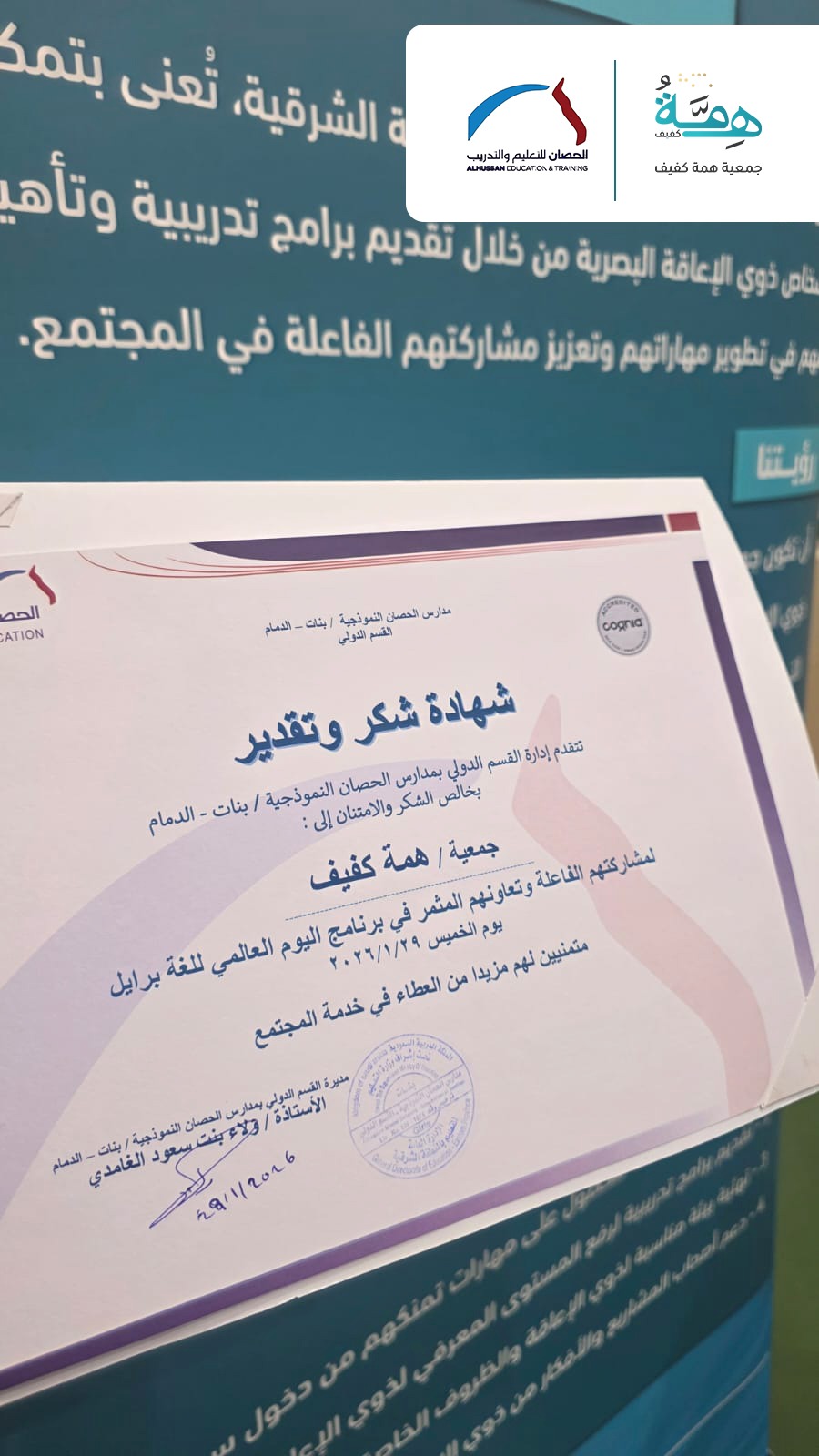 Al-Hussan National Schools for Girls- Dammam the international Section hosted Himmat Kafif Association for the Blind, where their team introduced us to the Braille system and explained how it works in a simple and engaging way. They also encouraged us to volunteer and learn more about this meaningful method.