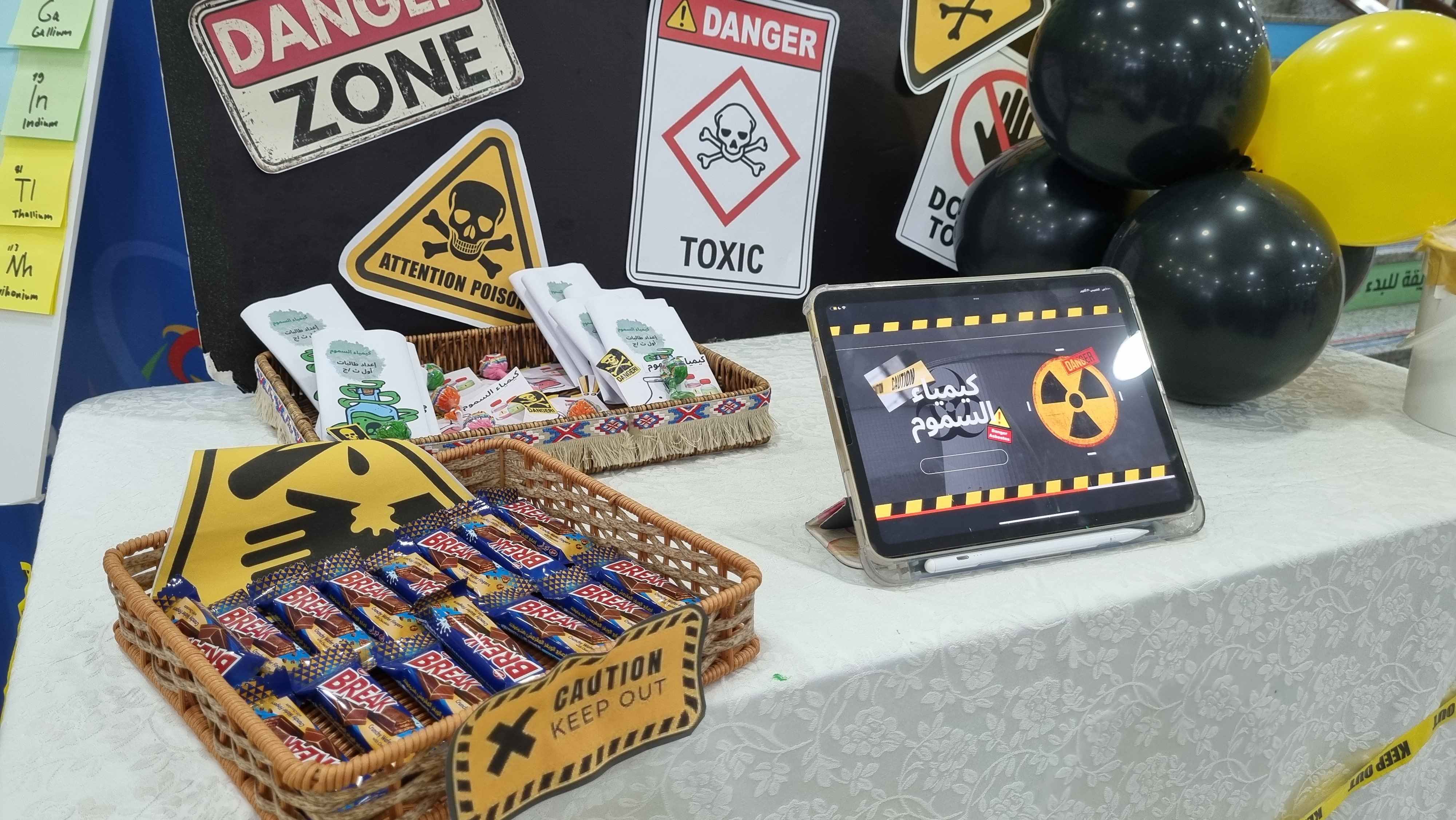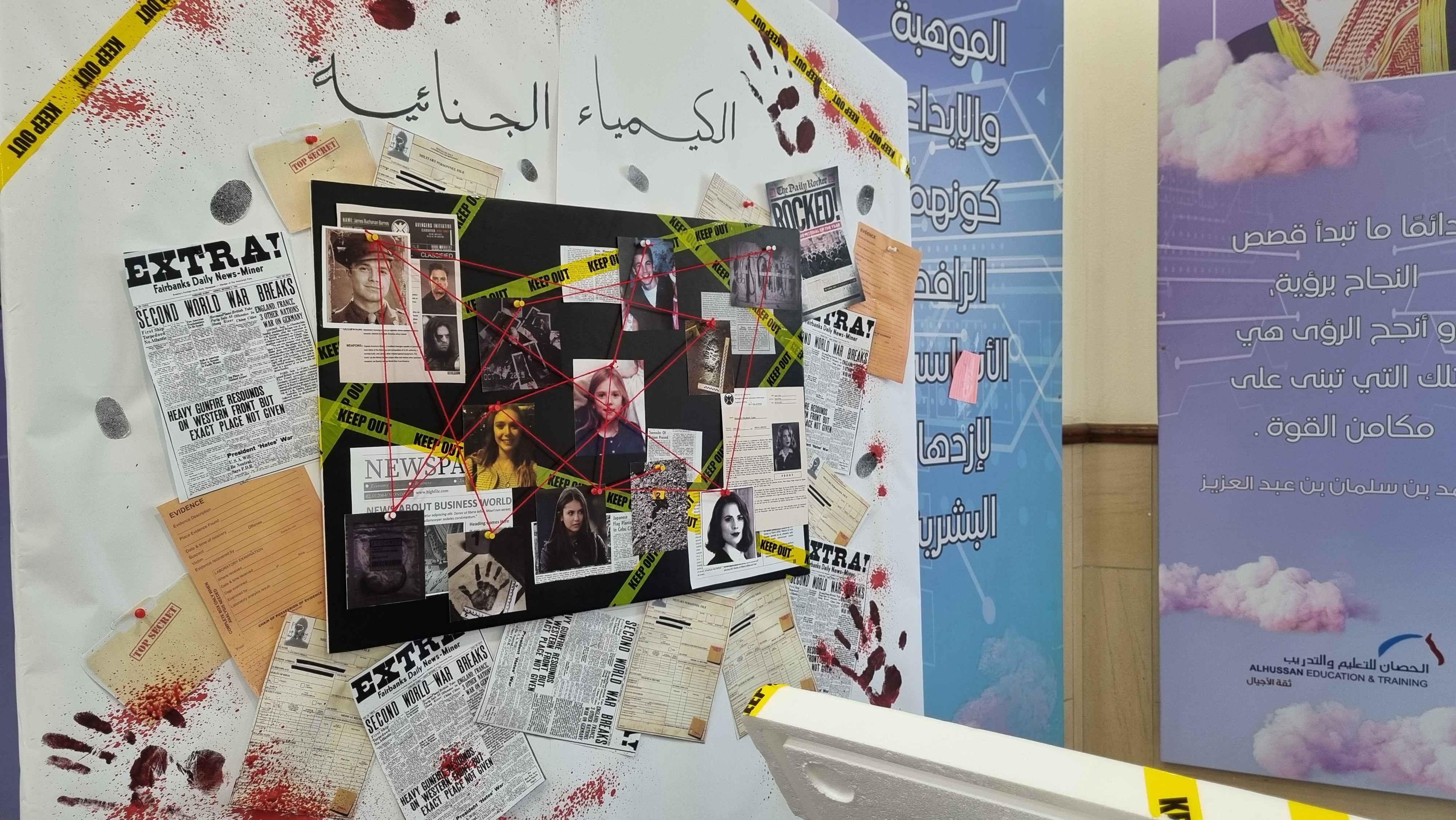 - قسم الكيمياء الجنائية: عرضت الطالبات فيه دور الكيمياء في تحليل الأدلة، والبصمات، والمواد المجهولة المستخدمة في حل القضايا.