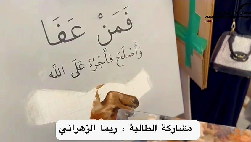 كما شاركت الطالبة ريما الزهراني برسم لوحة فنية معبرة حملت عنوان "فمن عفا" جسدت فيها المعنى العميق للعفو والتسامح مما أضفى على الركن لمسة فنية تعكس الحس الإبداعي لطالبات المدرسة.