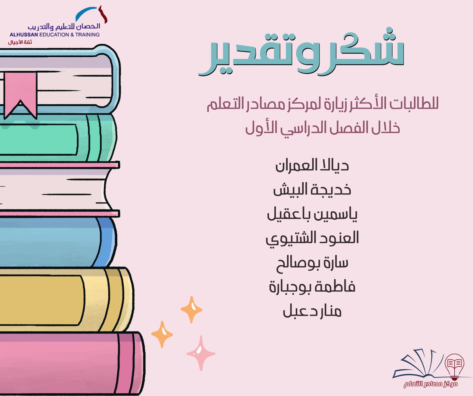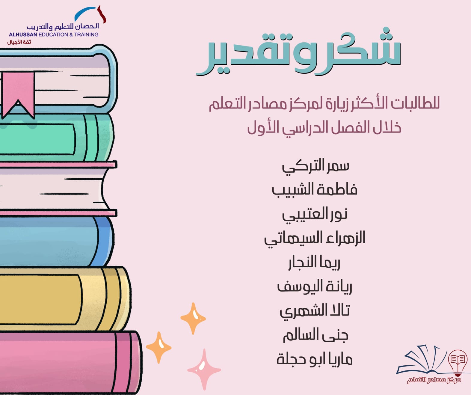 تتقدم مدارس الحصان النموذجية الأهلية للبنات بالدمام بخالص الشكر والتقدير للطالبات والفصول الأكثر زيارة لمركز مصادرالتعلّم خلال الفصل الدراسي الأول لعام 1447 هـ وذلك تقديراً لحرصهن على تنمية معارفهنً وتعزيز مهارات القراءة والبحث والاستفادة من مصادر المعرفة المتنوعة.