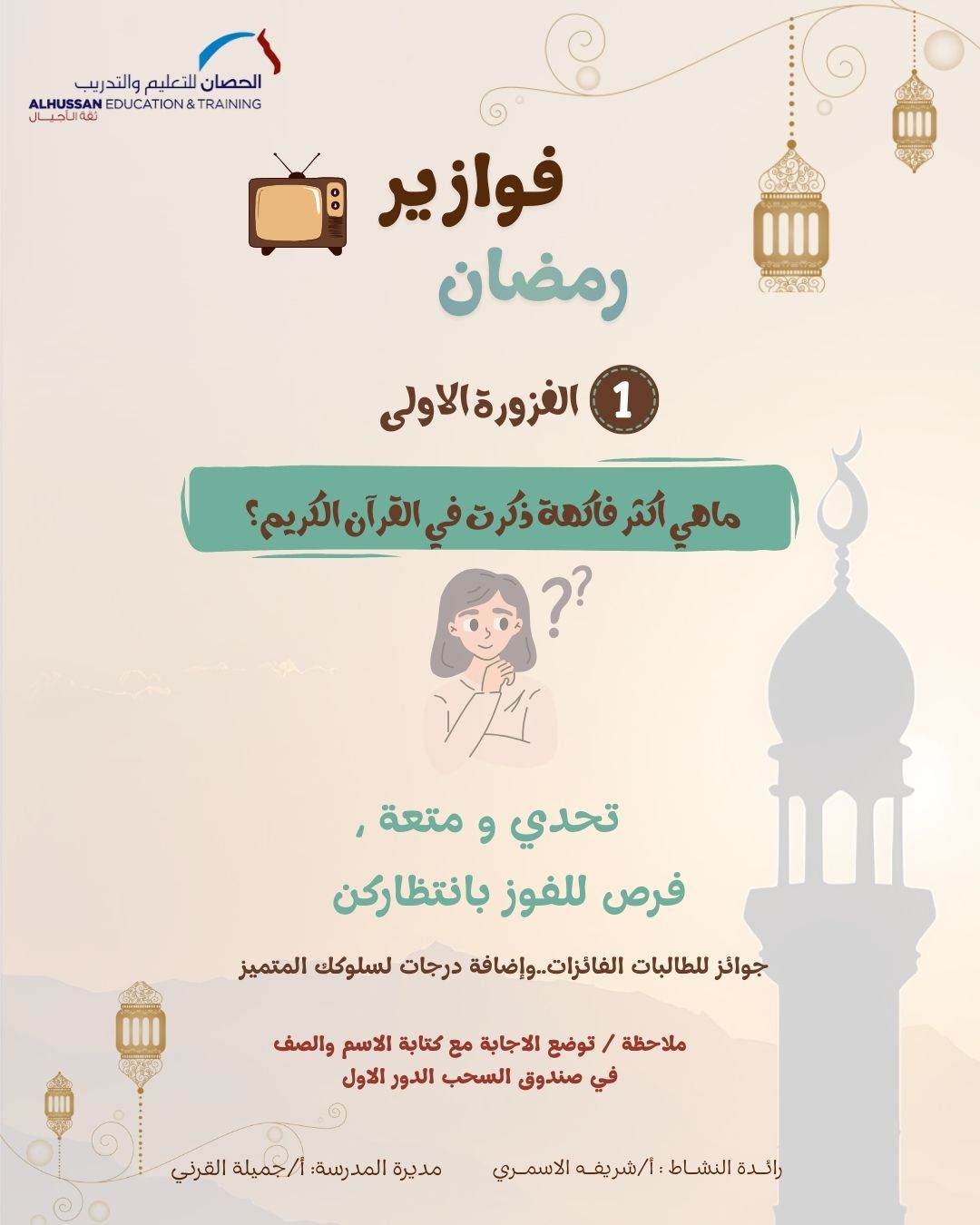 في أجواء رمضانية مليئة بالحماس والتفاعل، أطلقت مدارس الحصان النموذجية الأهلية للبنات بالدمام مسابقة فوازير رمضان بهدف تعزيز روح المنافسة الإيجابية وتنمية مهارات التفكير والتركيز لدى الطالبات خلال الشهر الفضيل. تعتمد المسابقة على طرح سؤال “فزورة” أسبوعيًا، يتم الإعلان عنه عبر الوسائل المعتمدة في المدرسة، حيث تقوم الطالبات بالإجابة عليه خلال المدة المحددة.