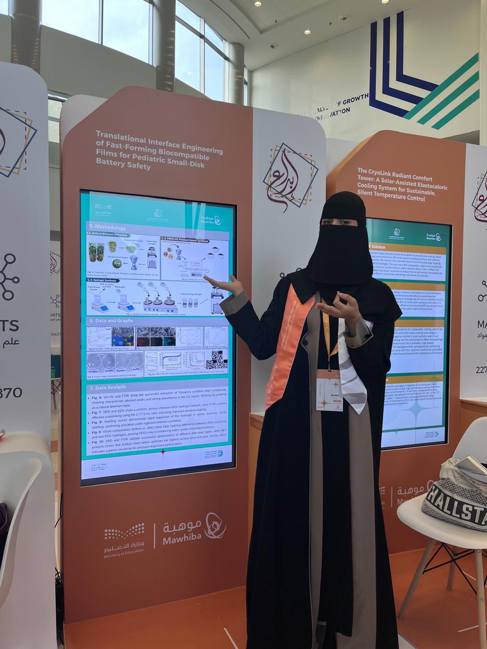 معرض إبداع للعلوم والهندسة 2026 م تأهلت الطالبة جمانة طلال بلال من ثانوية مدارس الحصان الأهلية للبنات بالجبيل للتصفيات النهائية لمعرض إبداع للعلوم والهندسة 2026 م , في مسار الريادة في الطاقة والصناعة.
