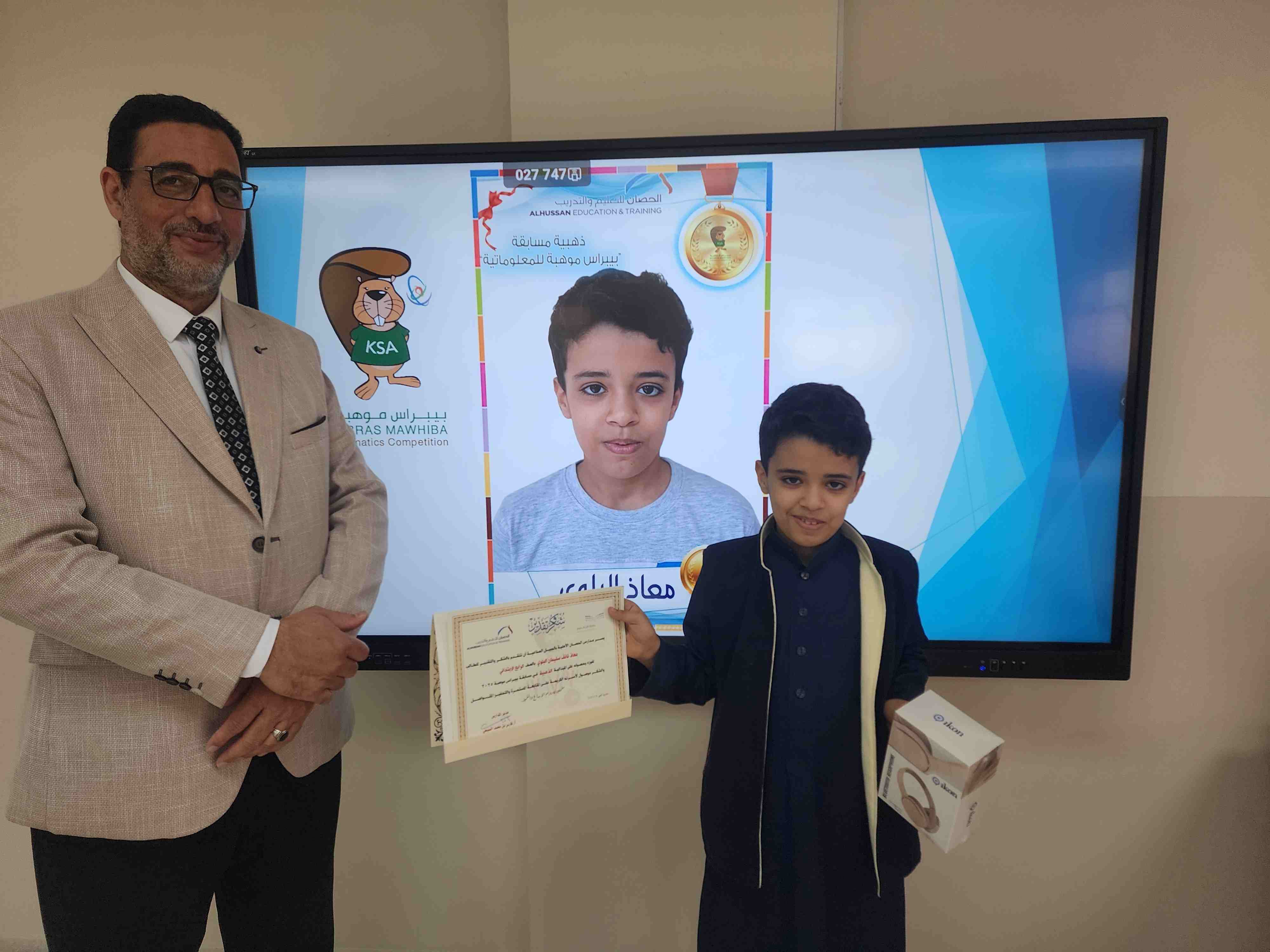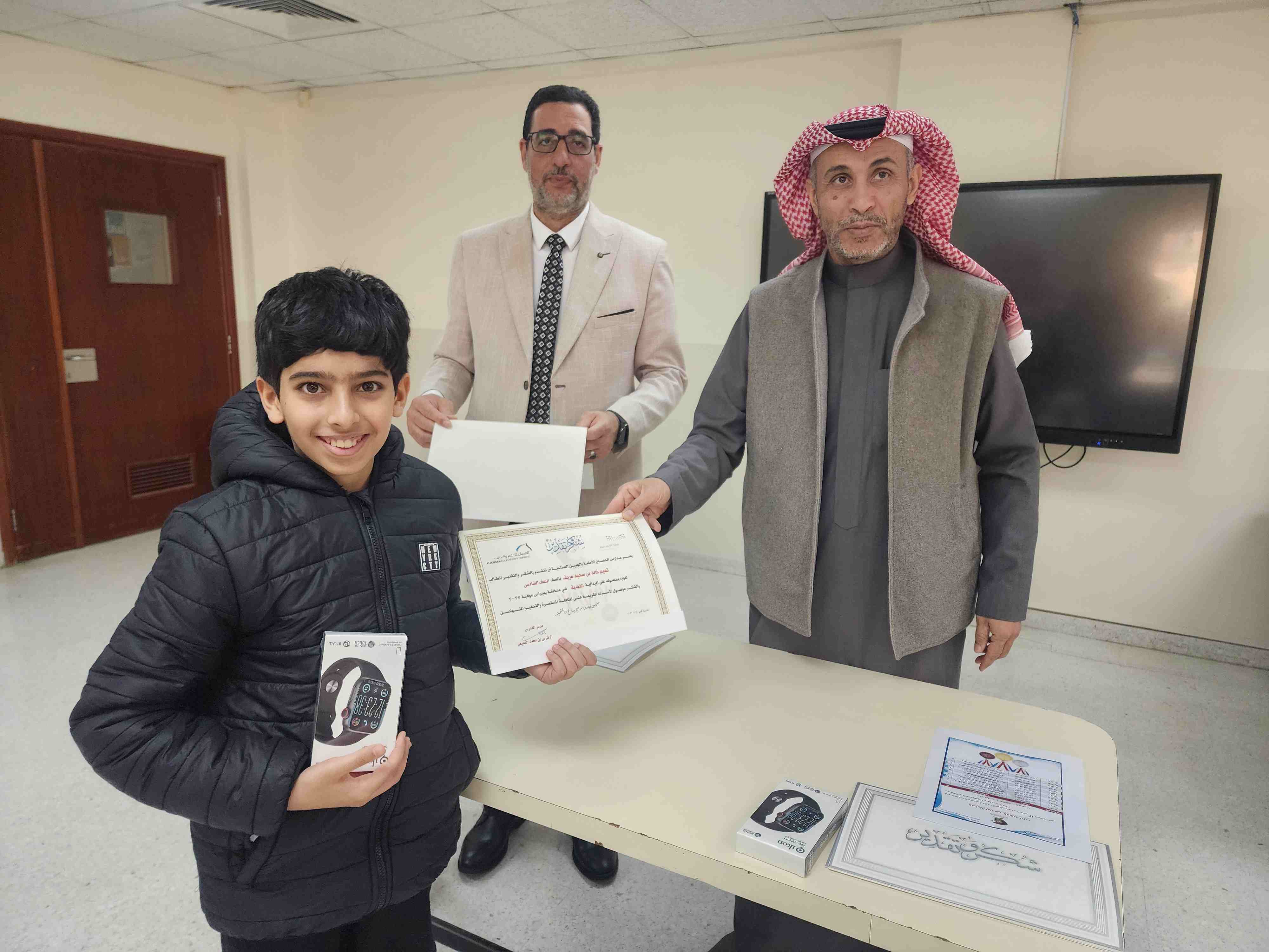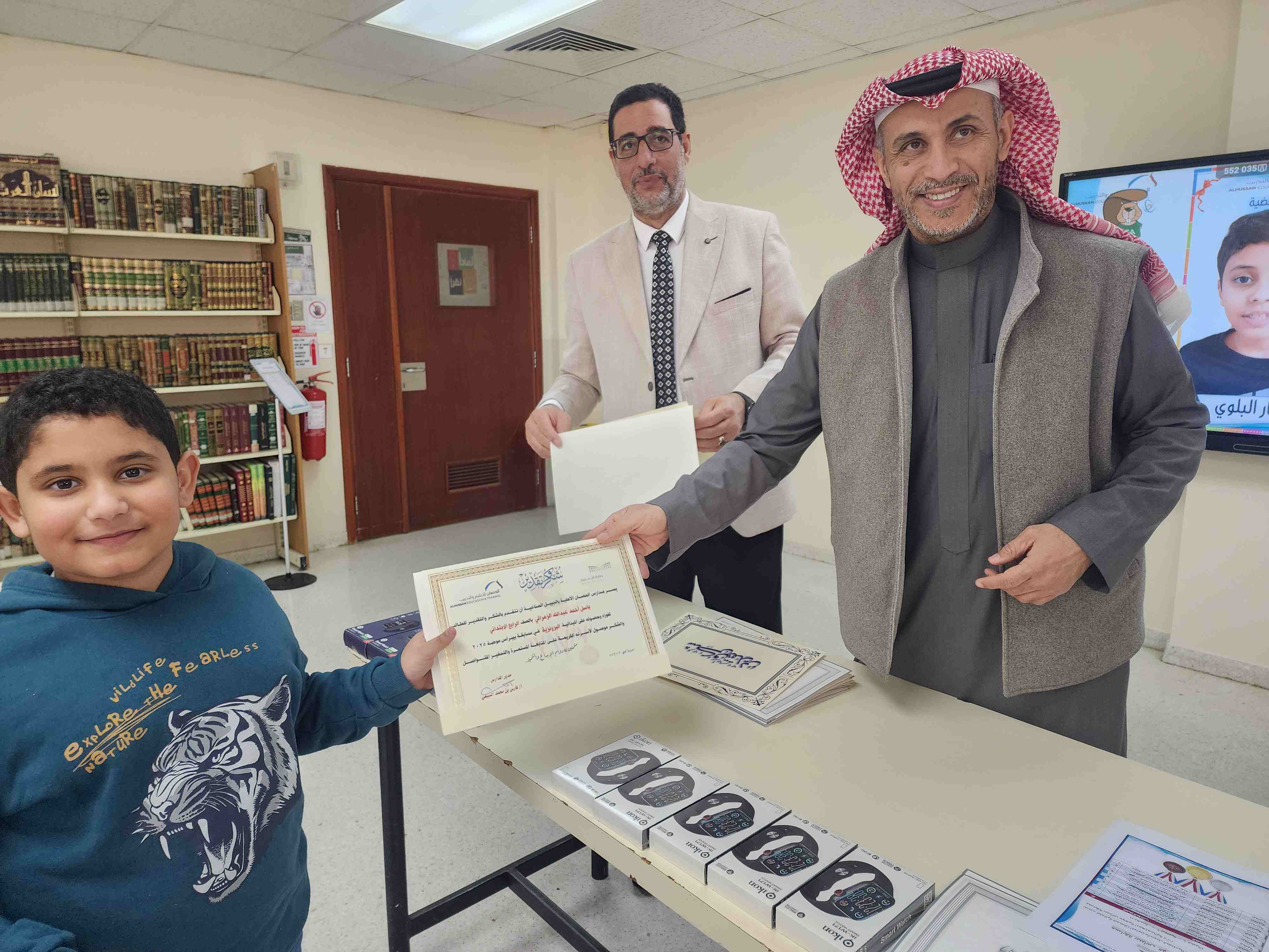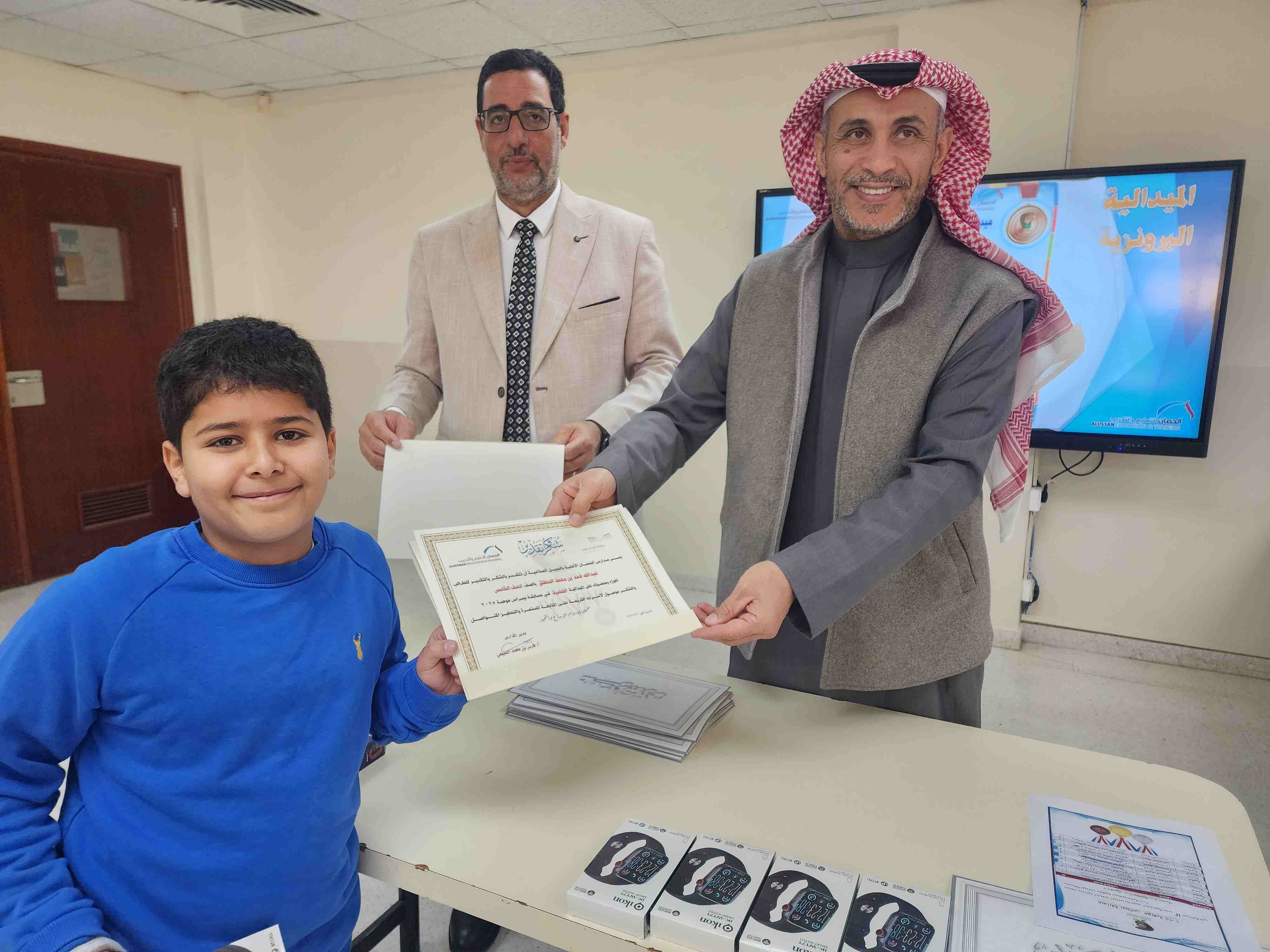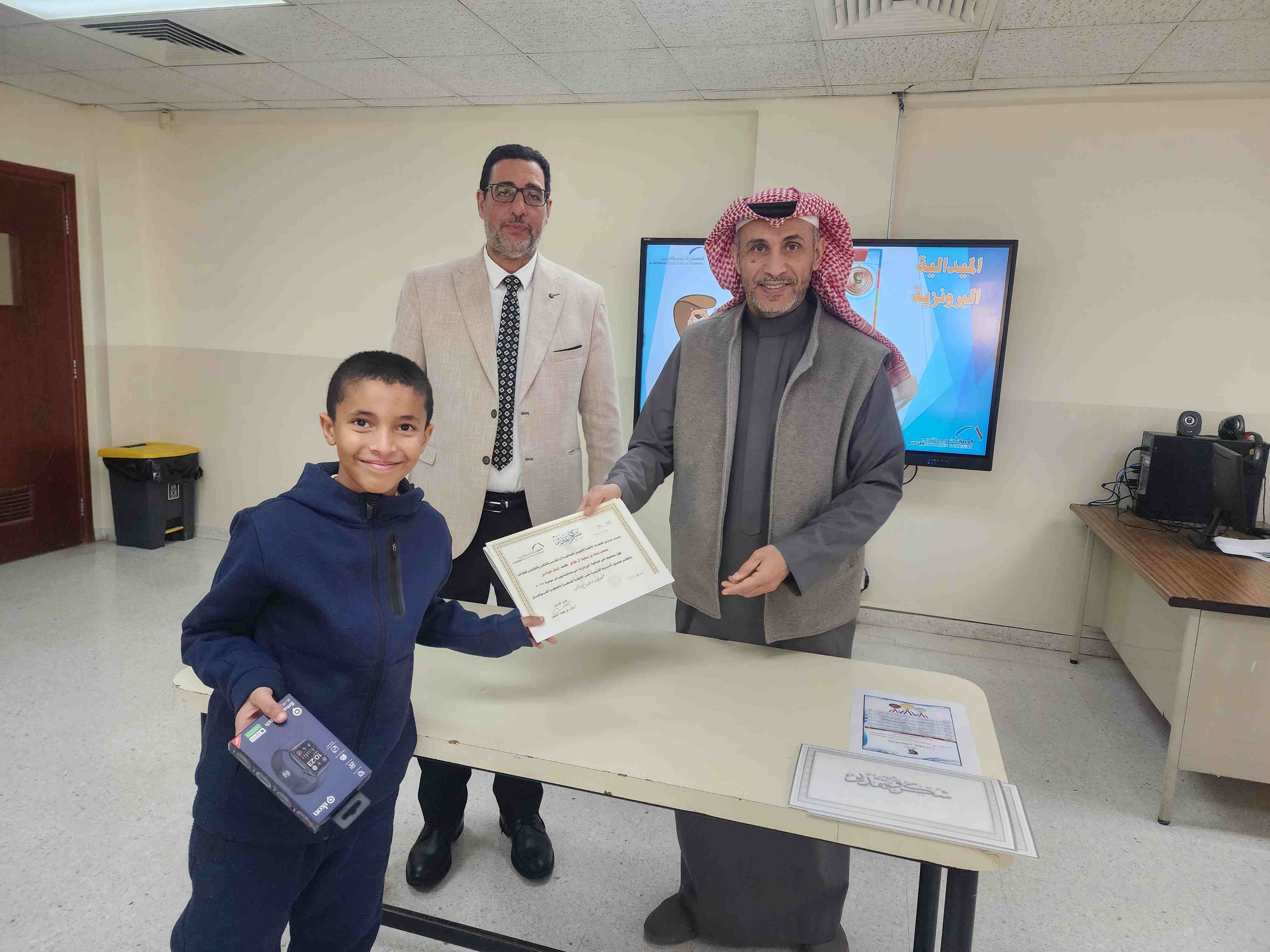 - وقد حصل الطالب معاذ نائف سليمان البلوي من الصف الرابع الابتدائي على الميدالية الذهبية.