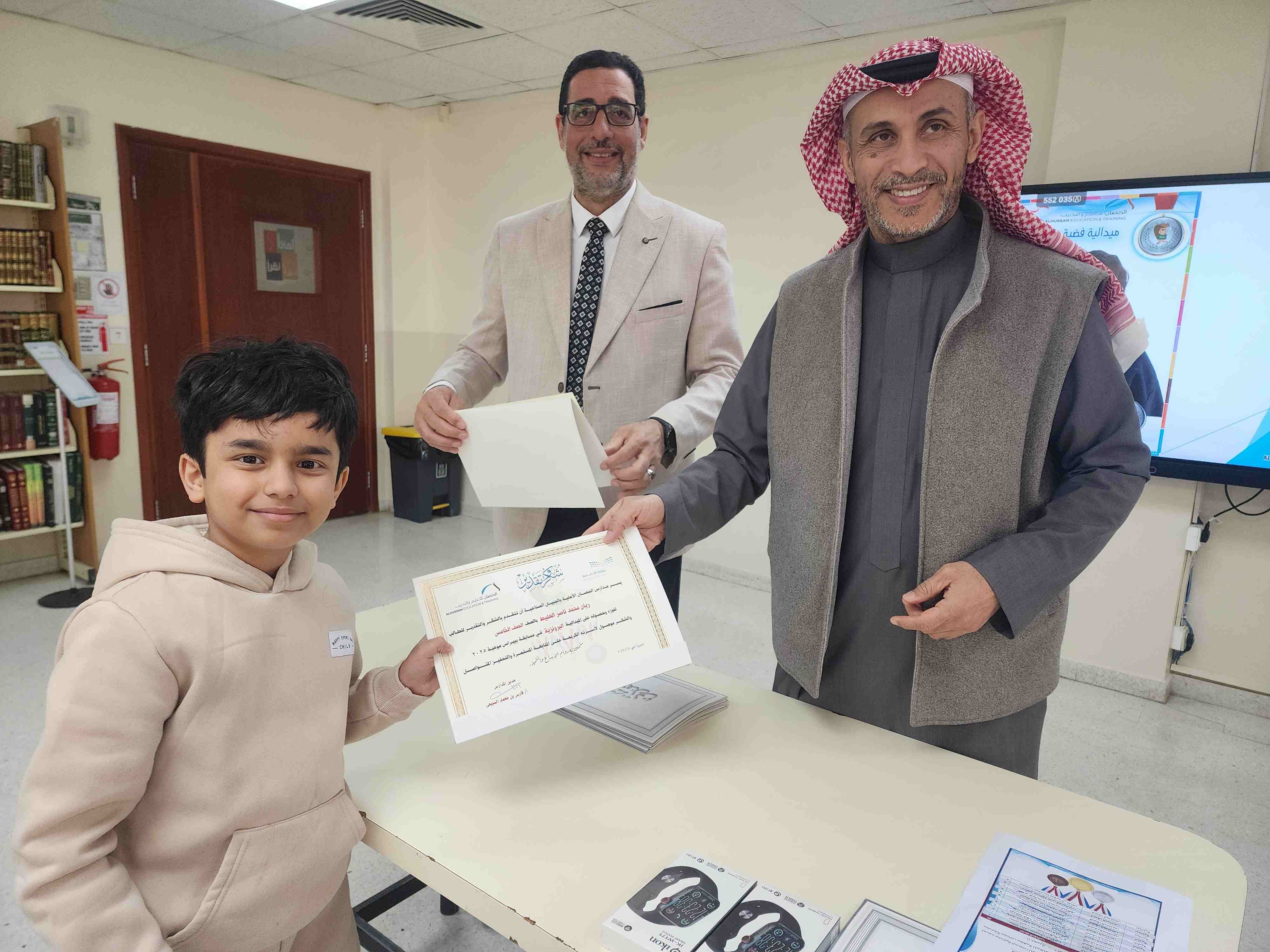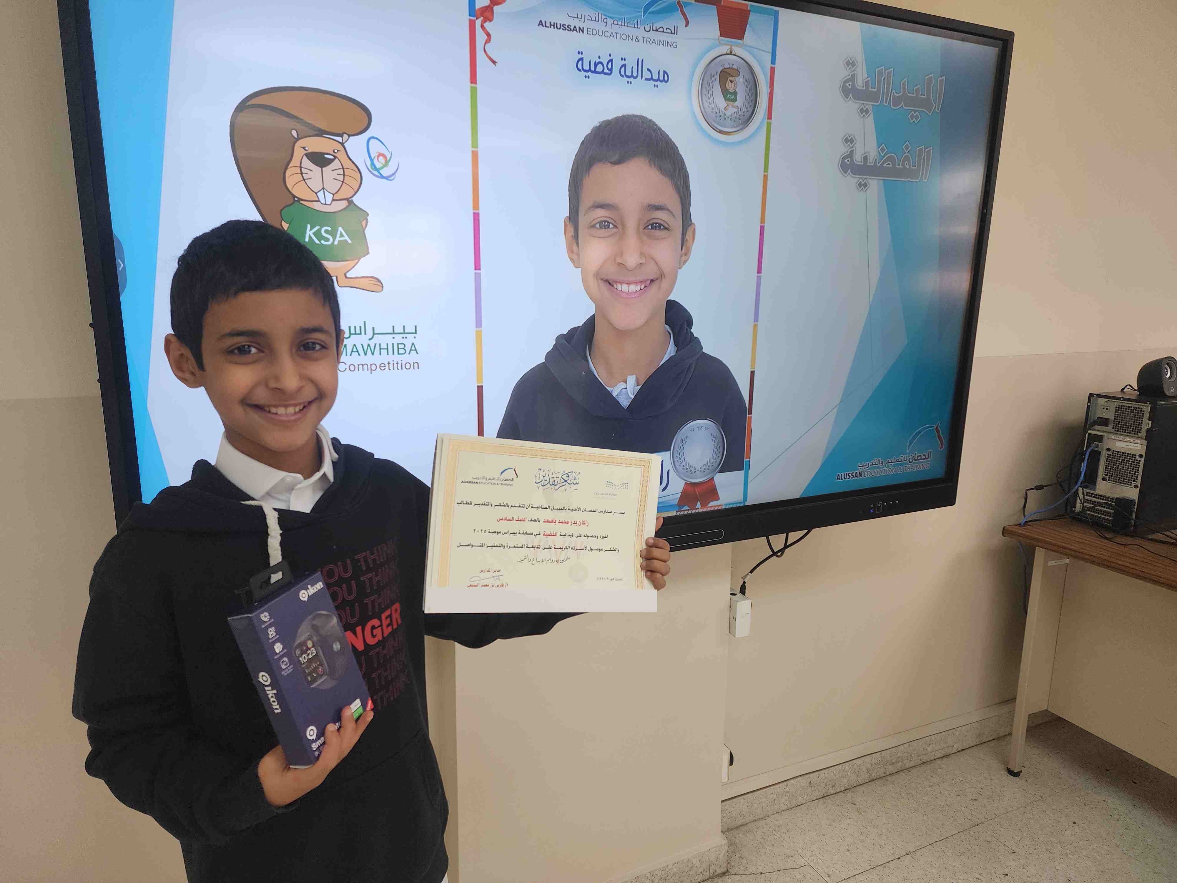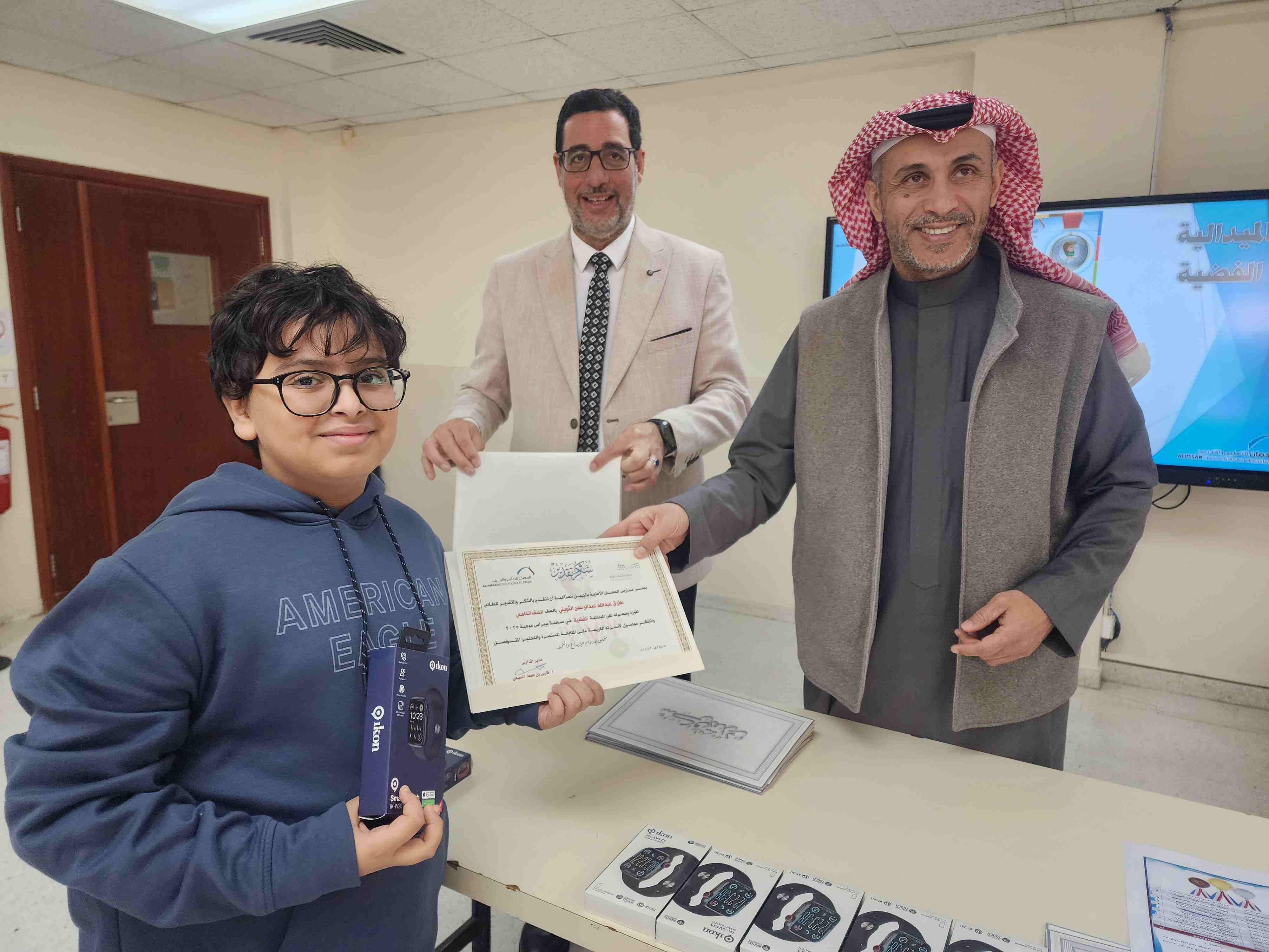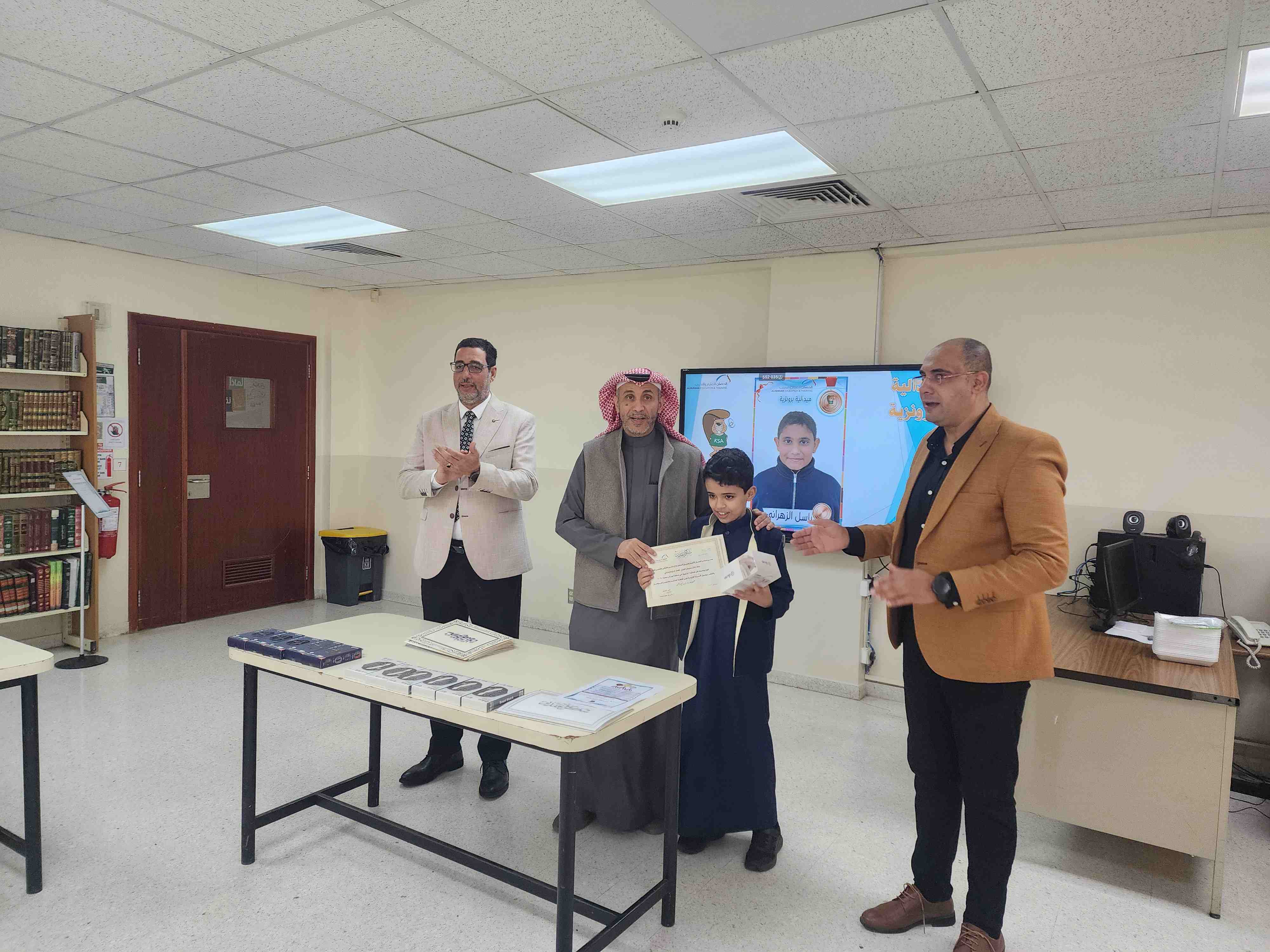 - وقد حصل الطالب معاذ نائف سليمان البلوي من الصف الرابع الابتدائي على الميدالية الذهبية.