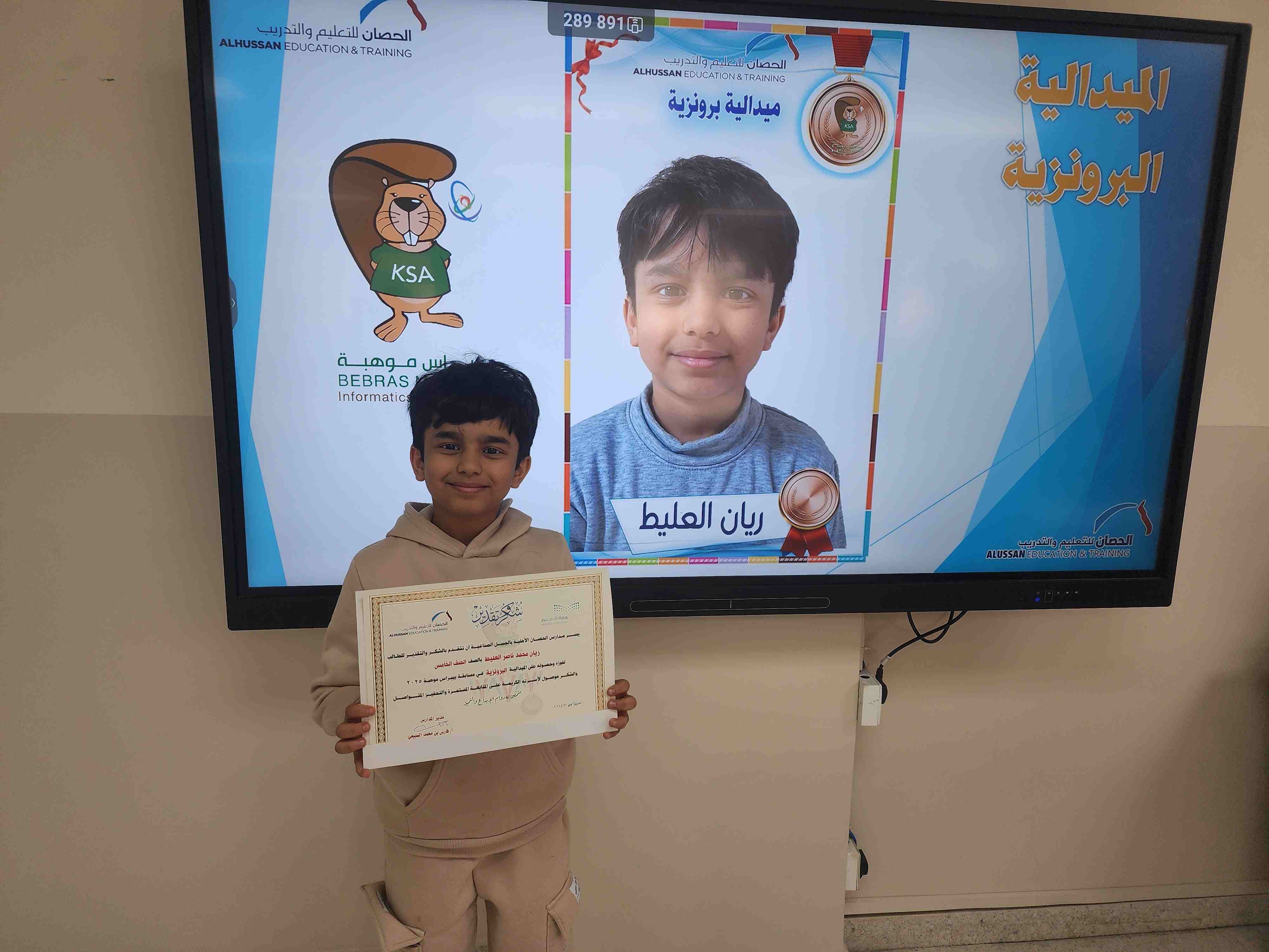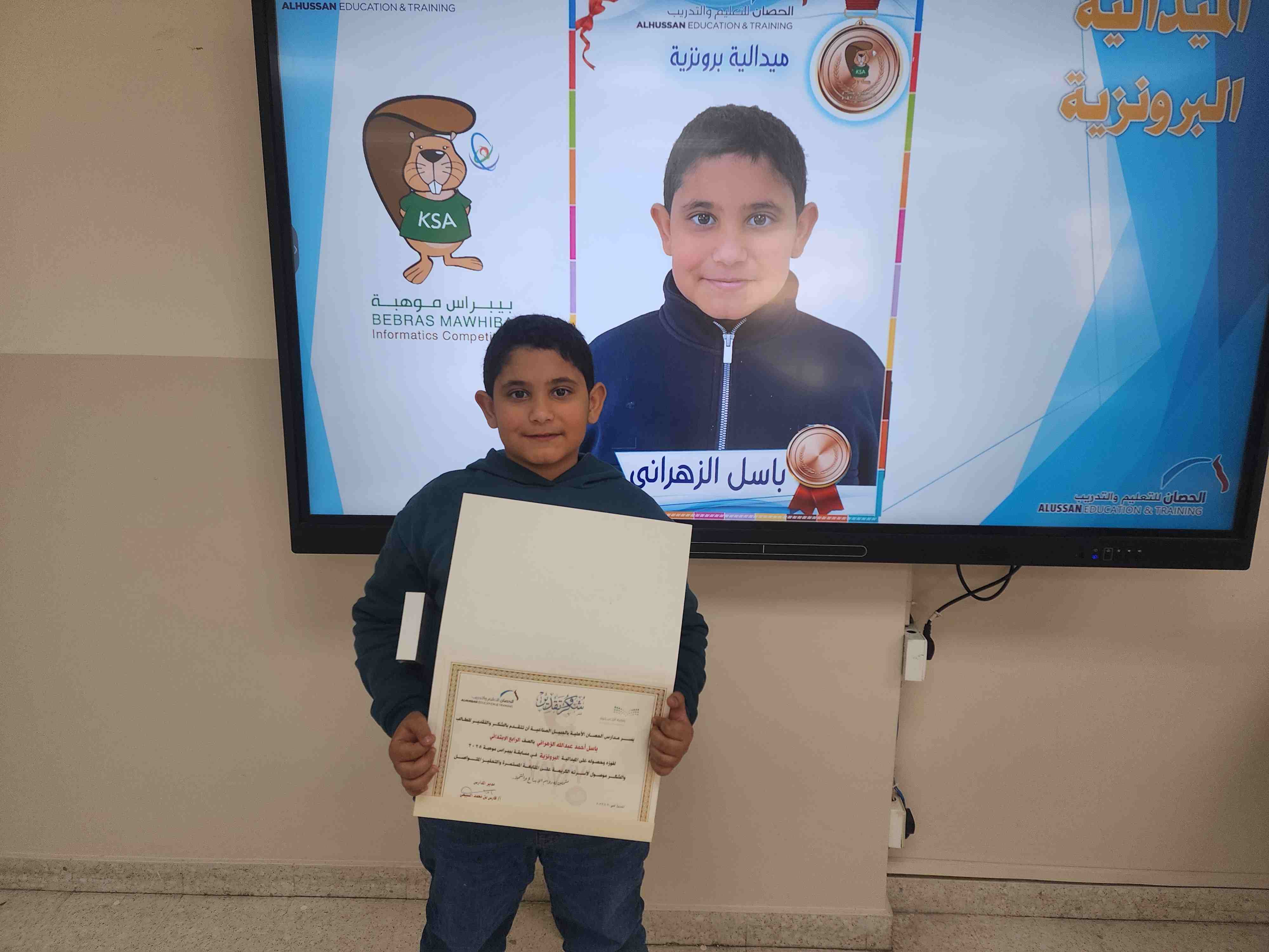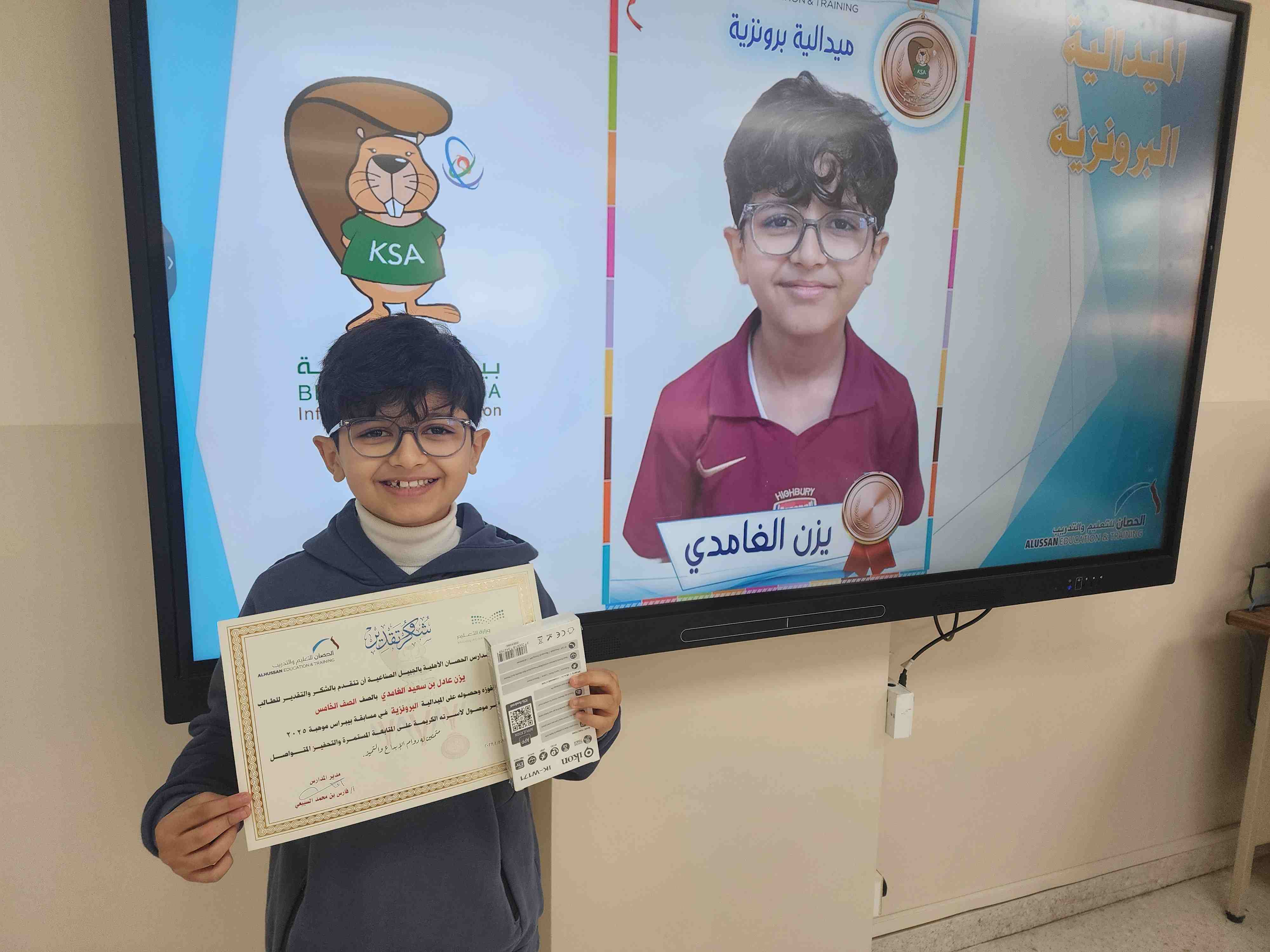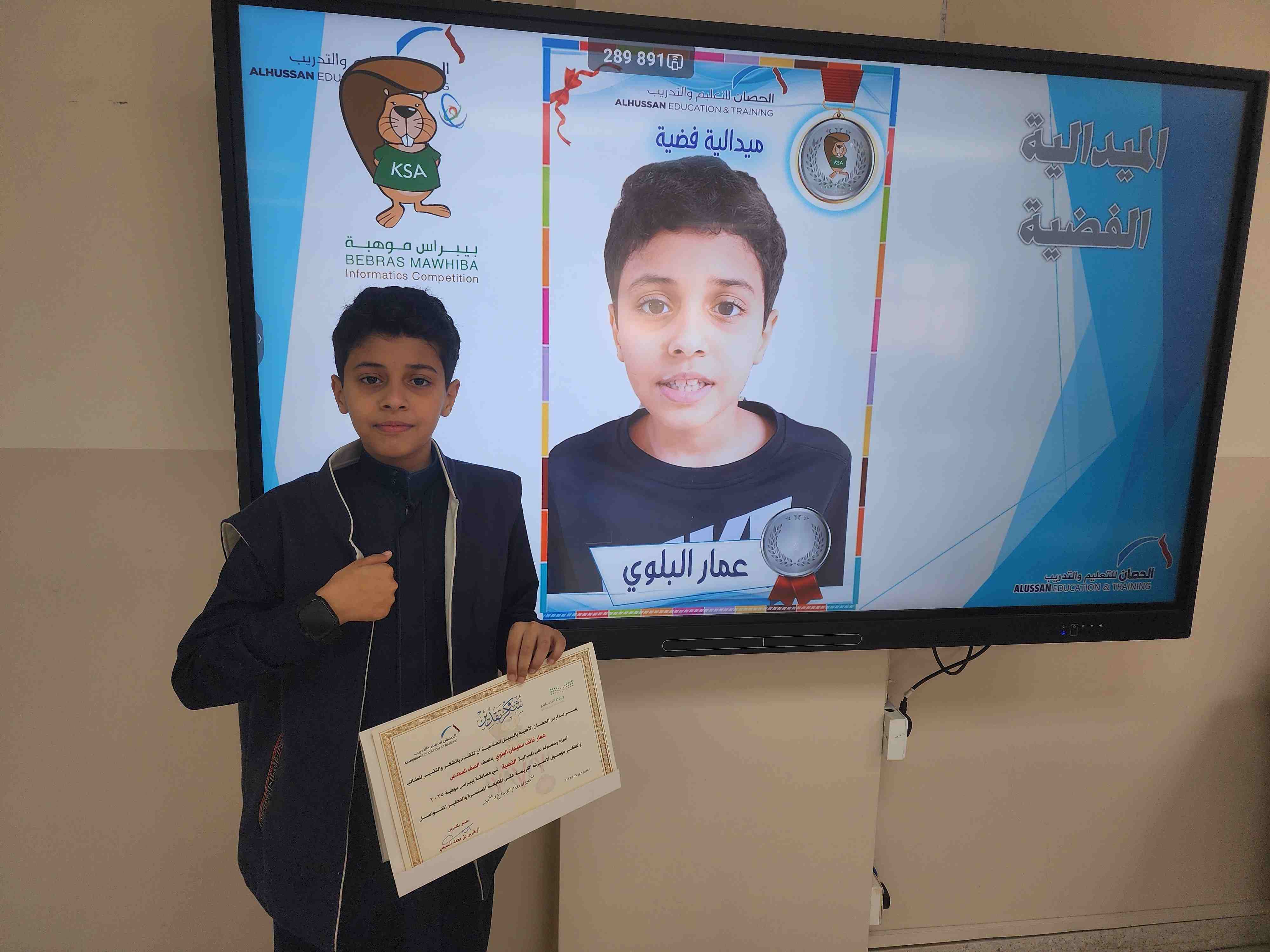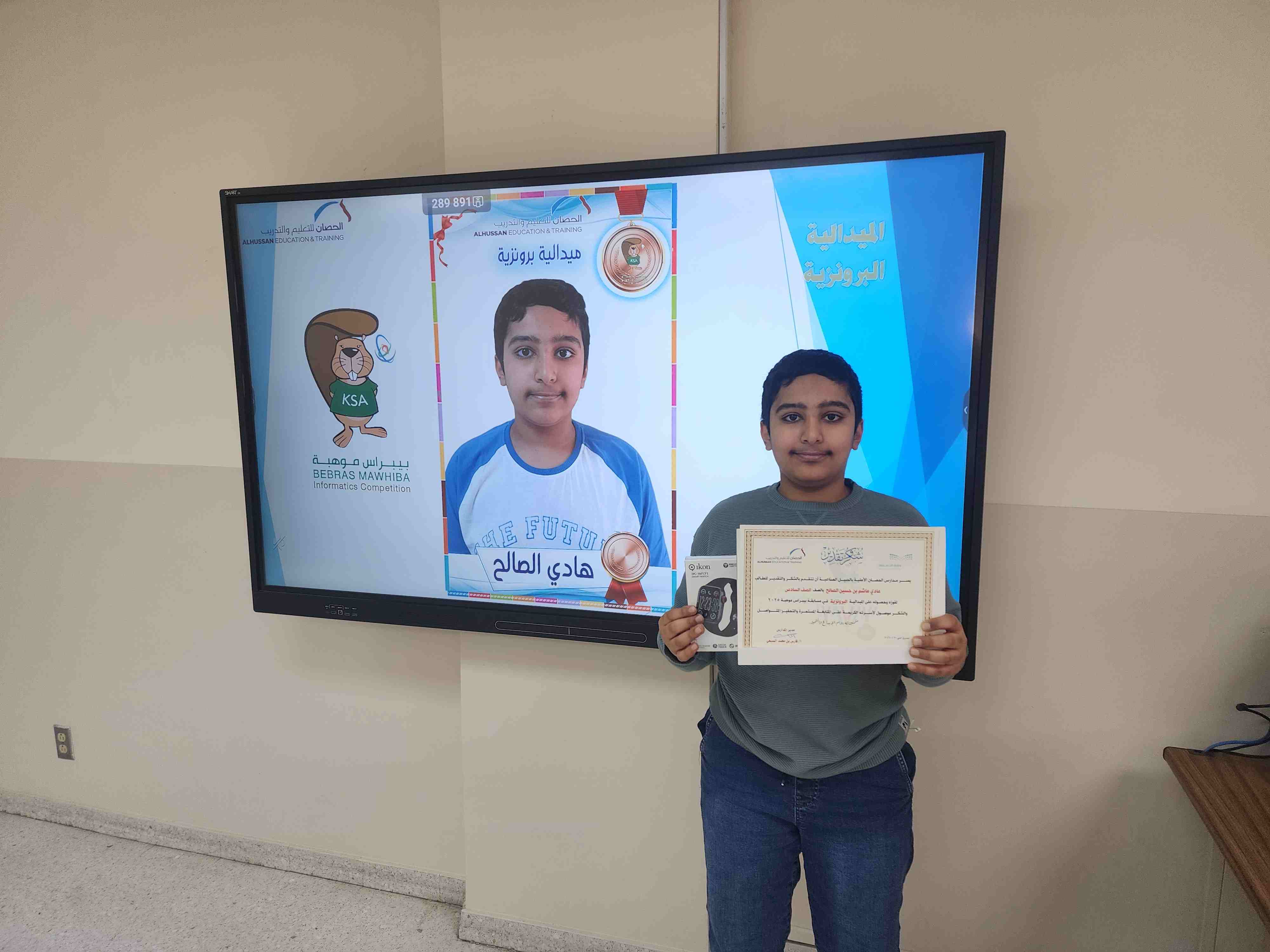 - وقد حصل الطالب معاذ نائف سليمان البلوي من الصف الرابع الابتدائي على الميدالية الذهبية.