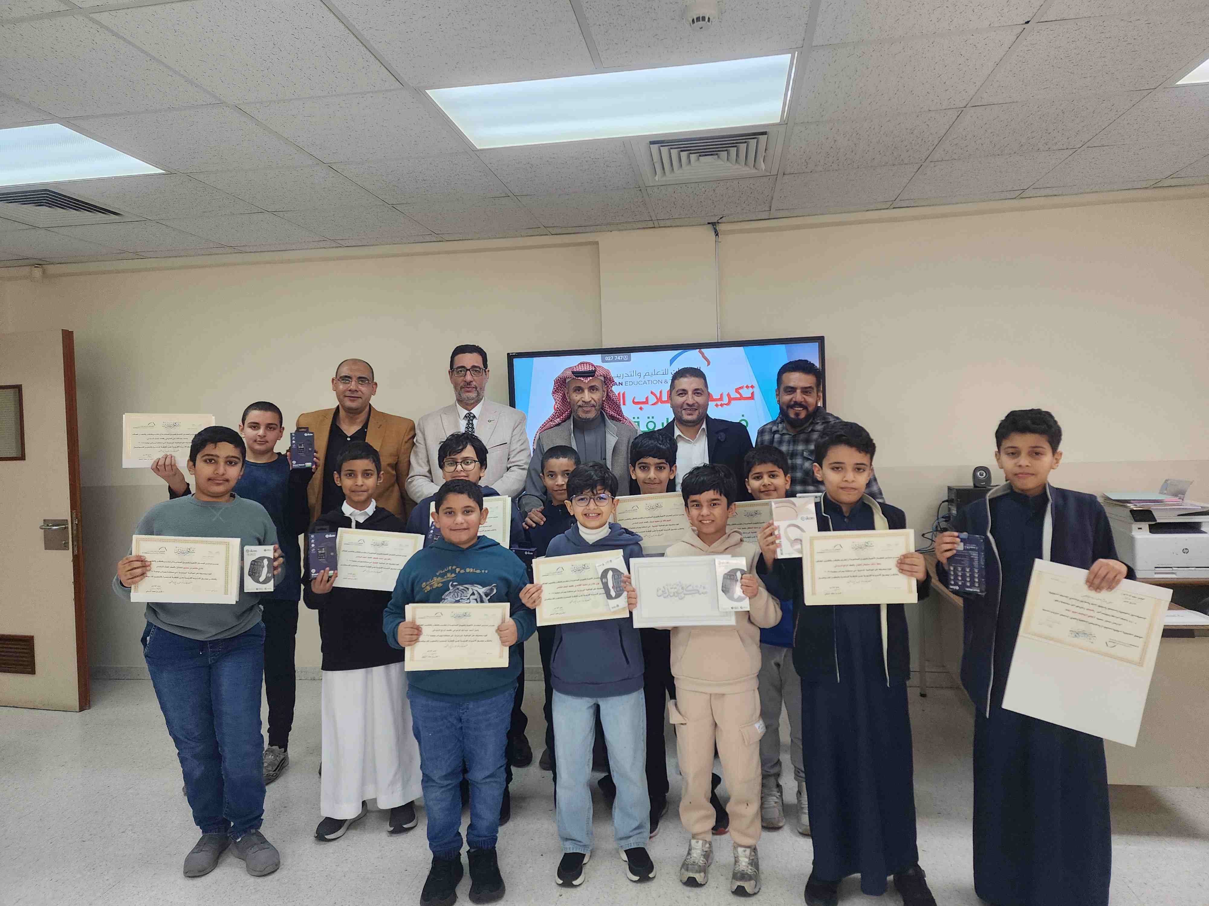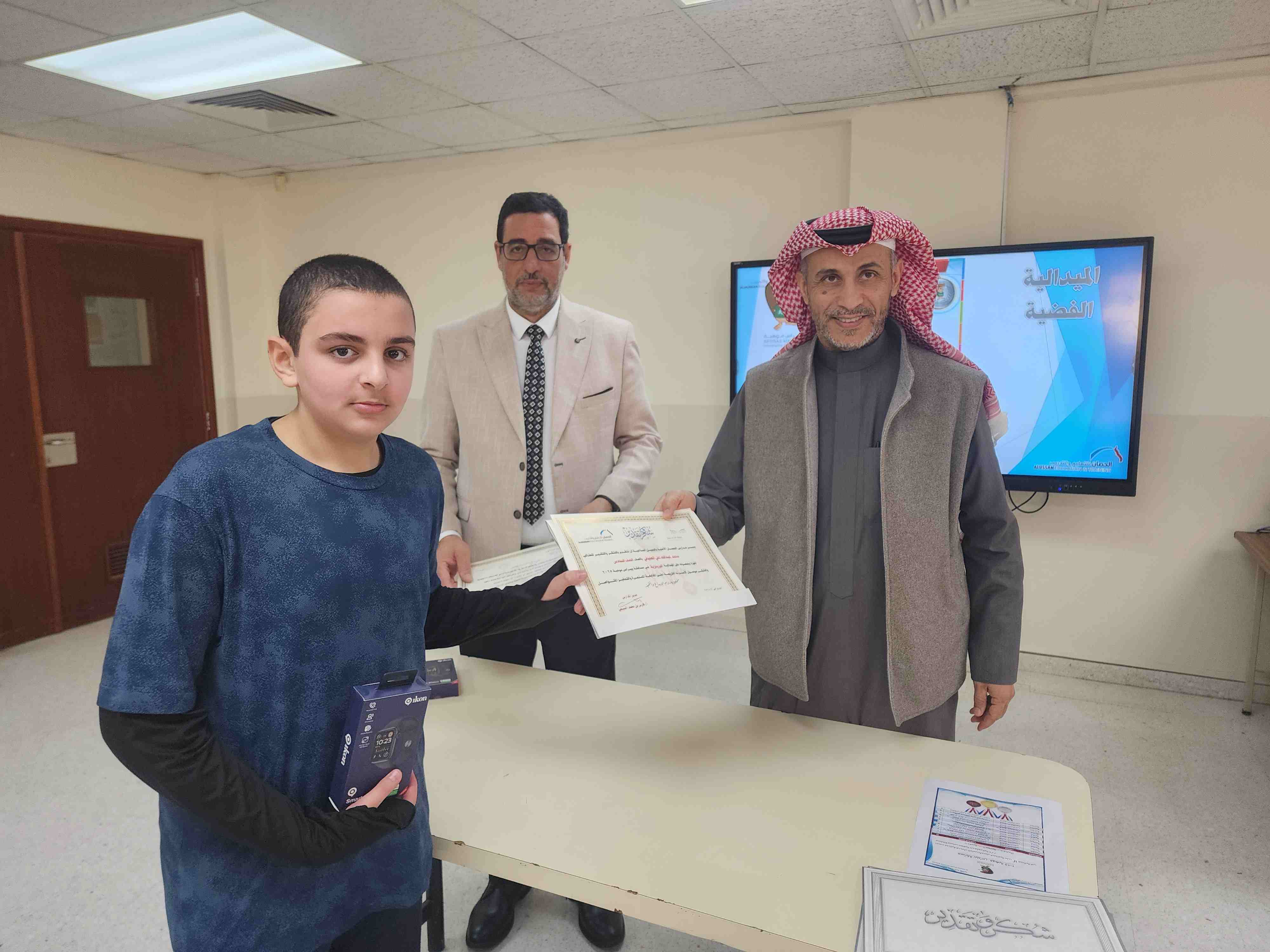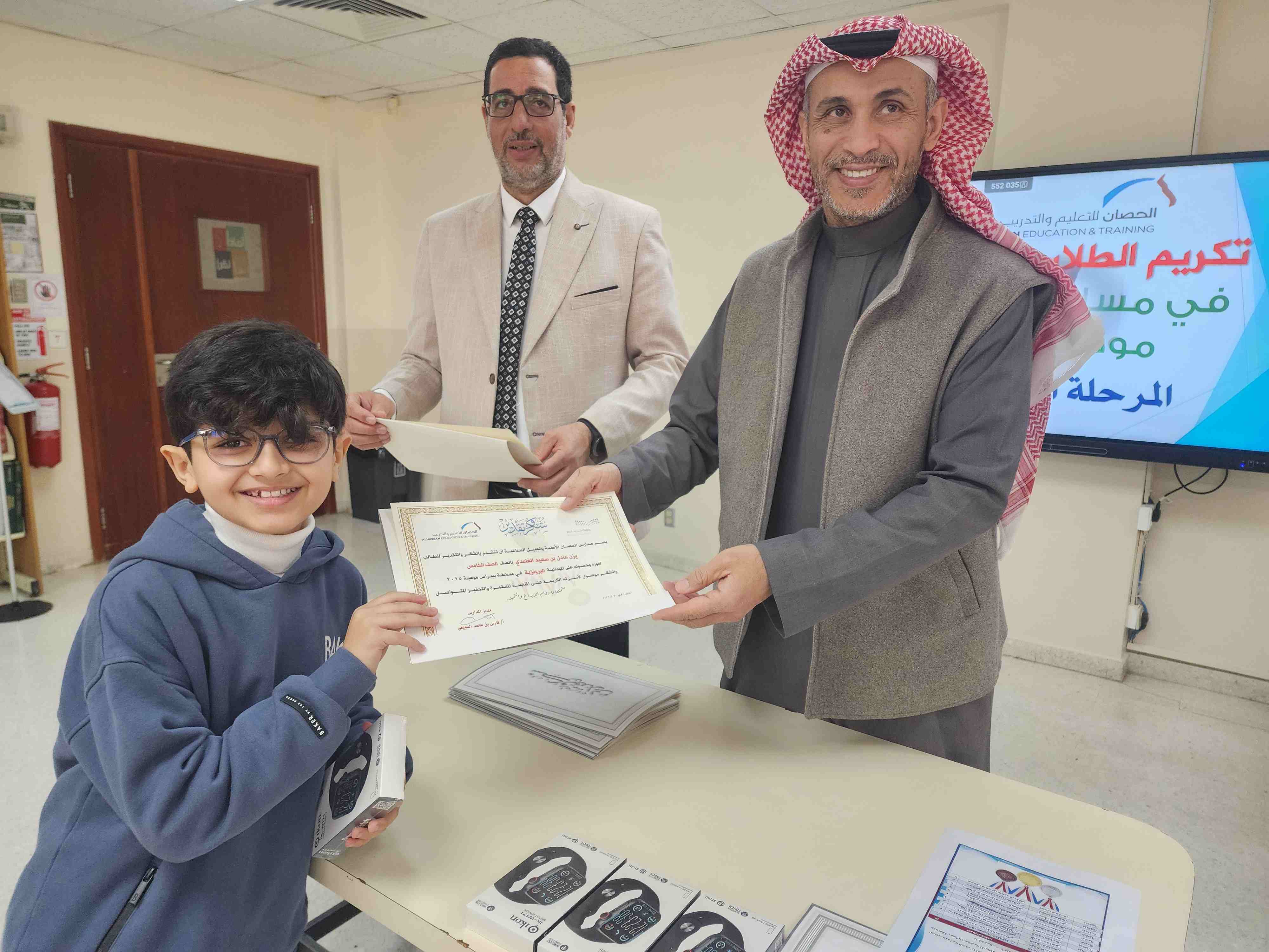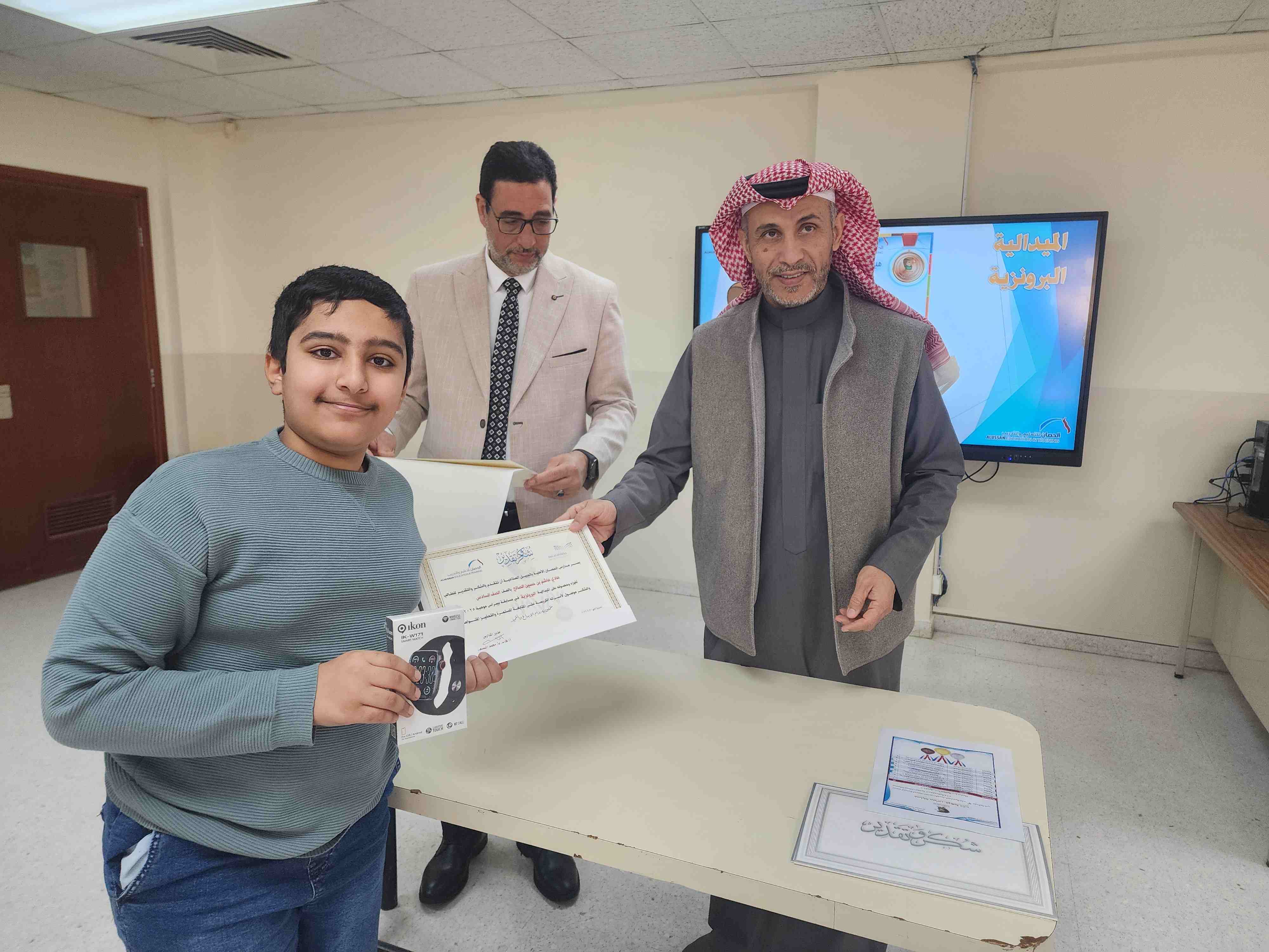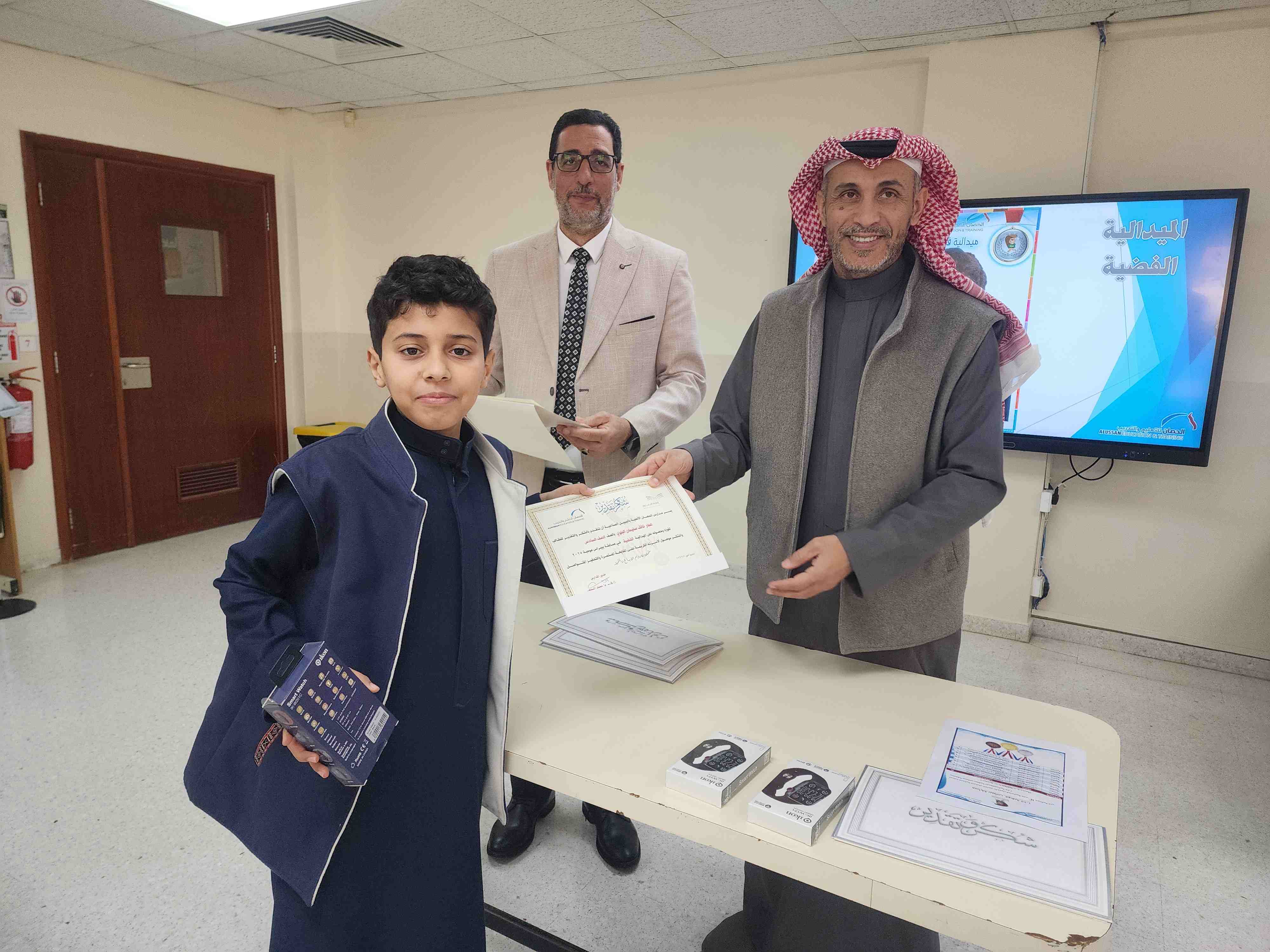 وفي ختام الإنجاز، تم تكريم الطلاب الفائزين من قبل مدير المدرسة ووكيل المرحلة، كما شمل التكريم المعلمين المدربين تقديرًا لجهودهم في إعداد الطلاب ودعمهم للمشاركة في المسابقة، متمنين للجميع دوام التوفيق والنجاح.