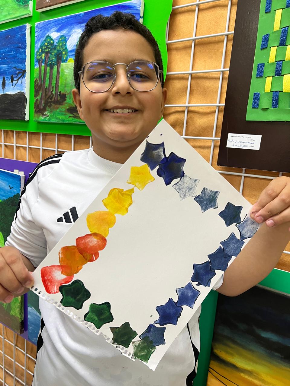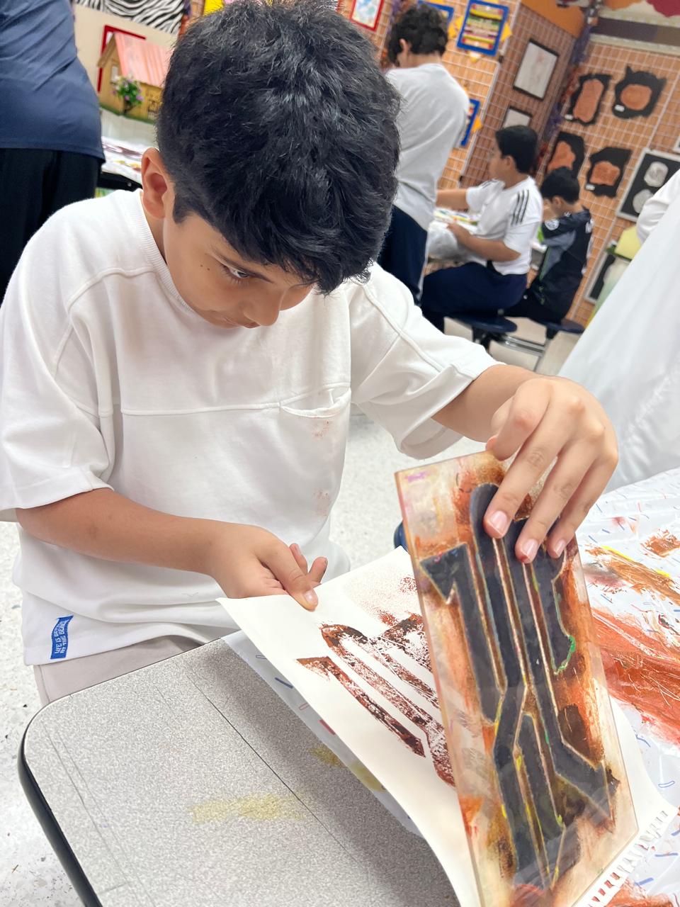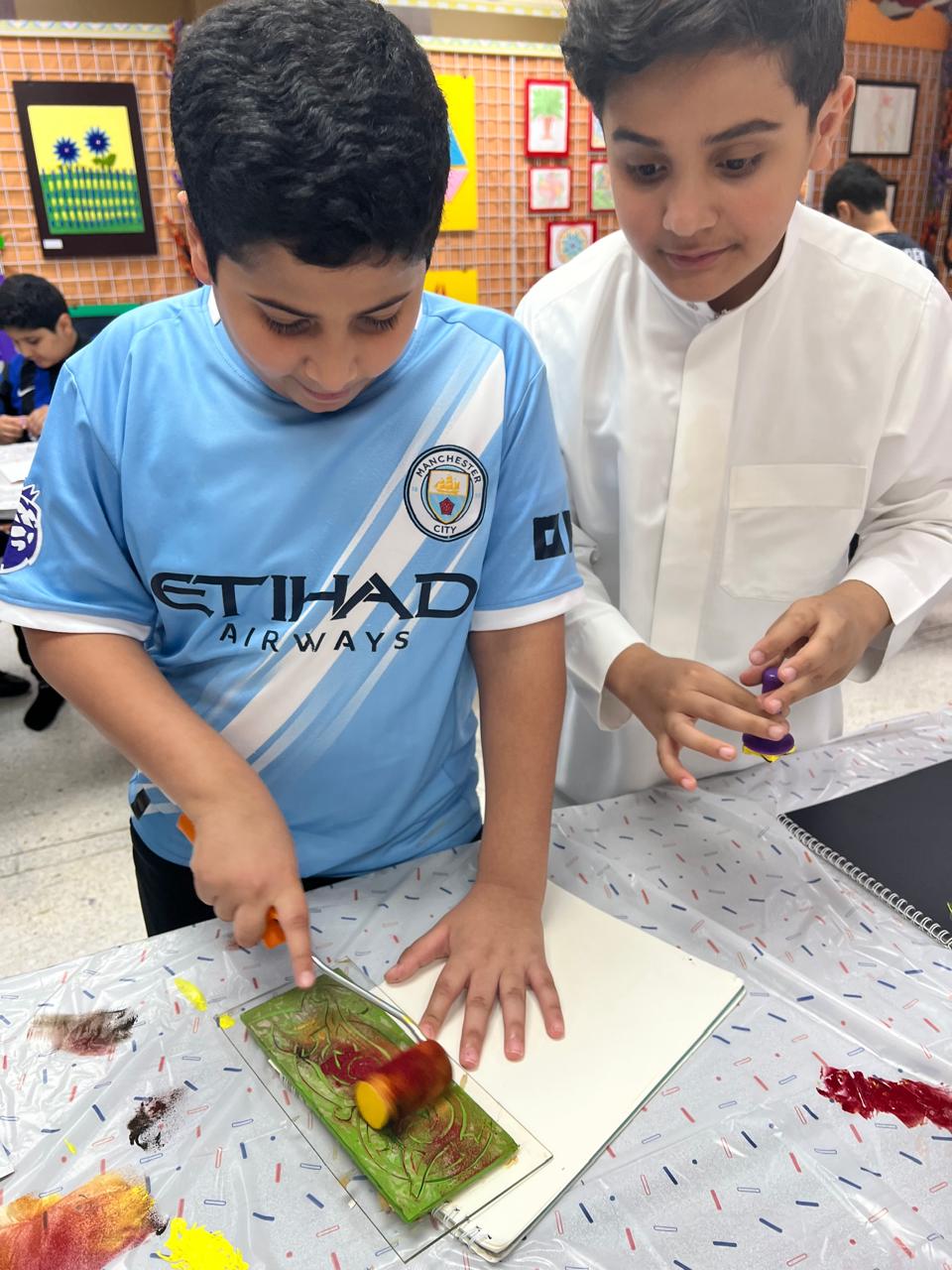 فن الطباعة بالقالب استمتع طلاب الصف السادس بالجبيل بتنفيذ طباعة القالب، ويعتبر فن الطباعة بالقالب من أمتع المهارات الفنية التي تهدف إلى زخرفة الأسطح الورقية والقماشية باستخدام وحدات هندسية ونباتية متكررة، مما يساعد الطلاب على فهم أسس التصميم والتكرار.
